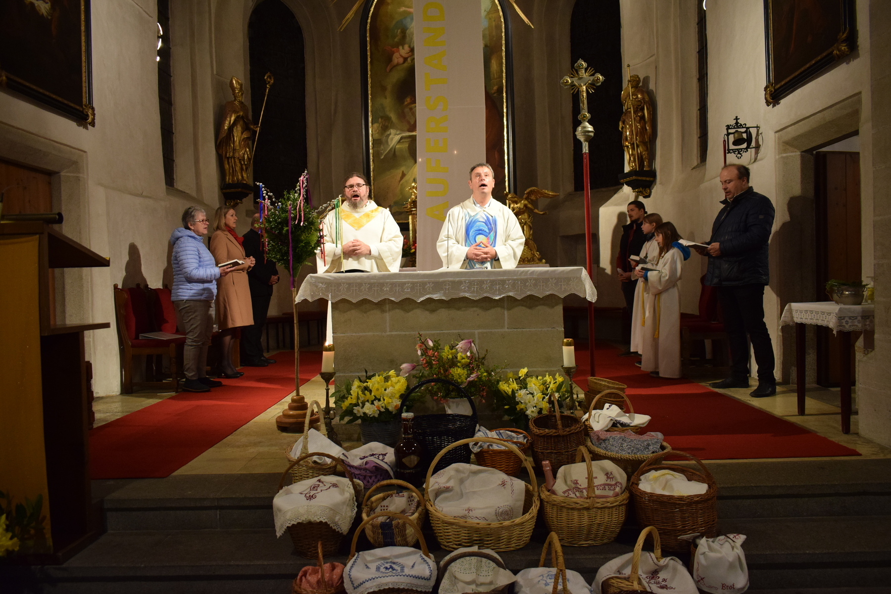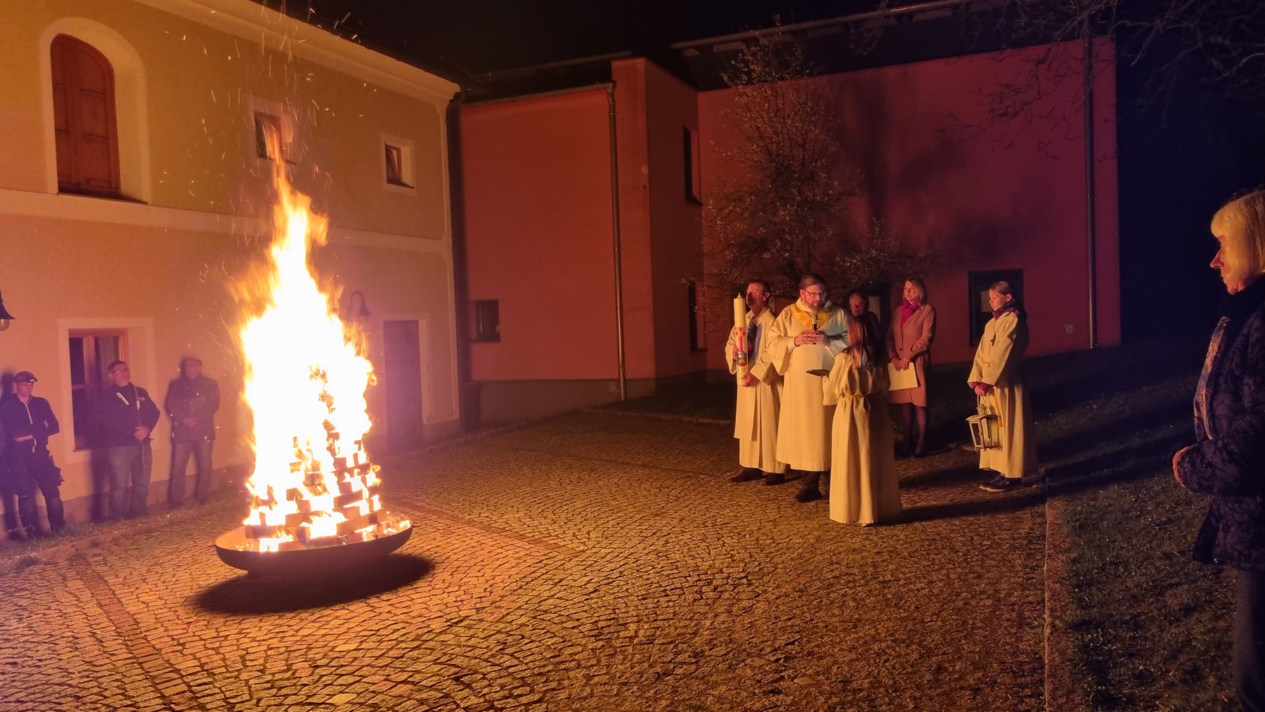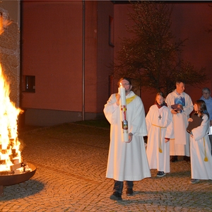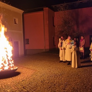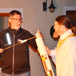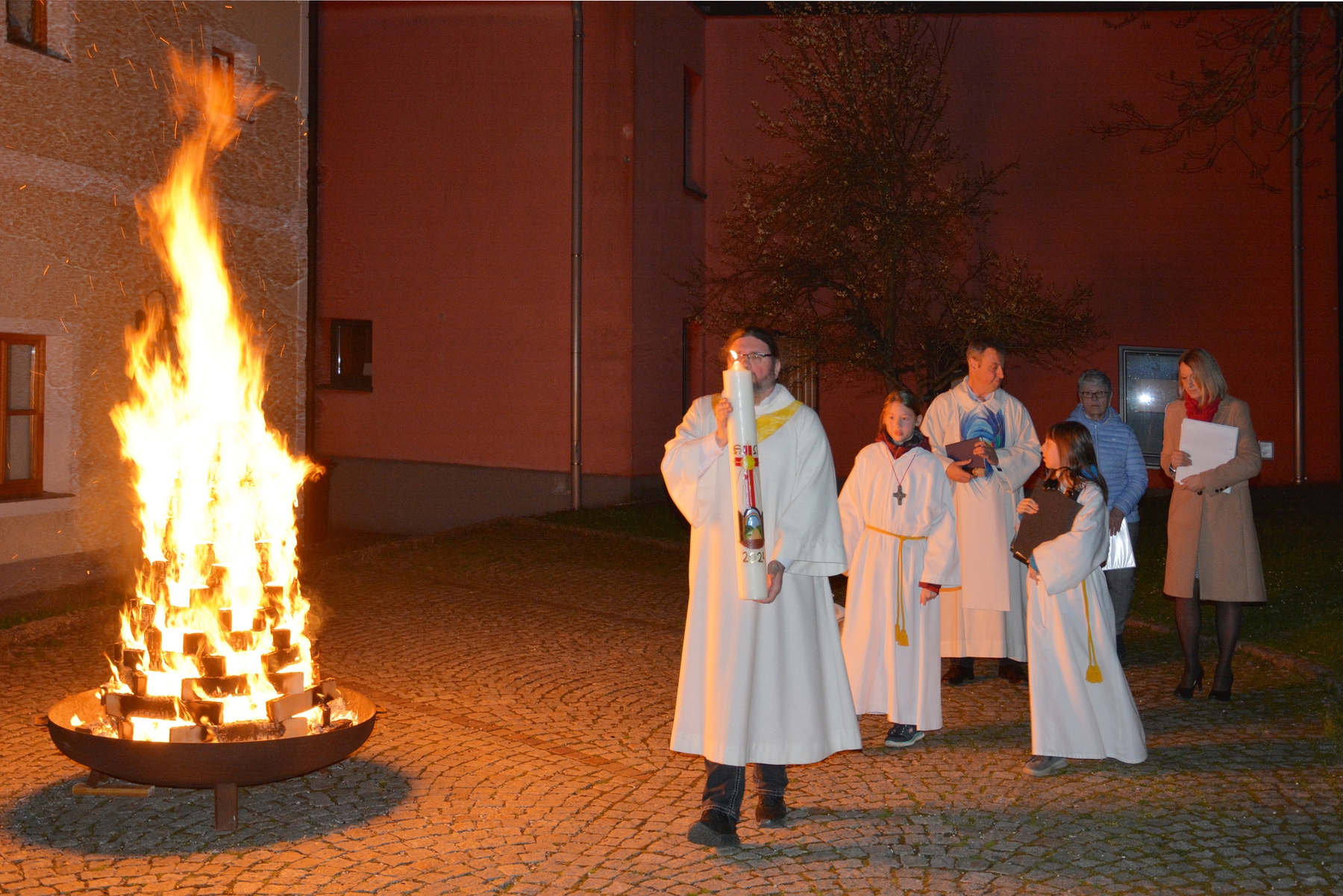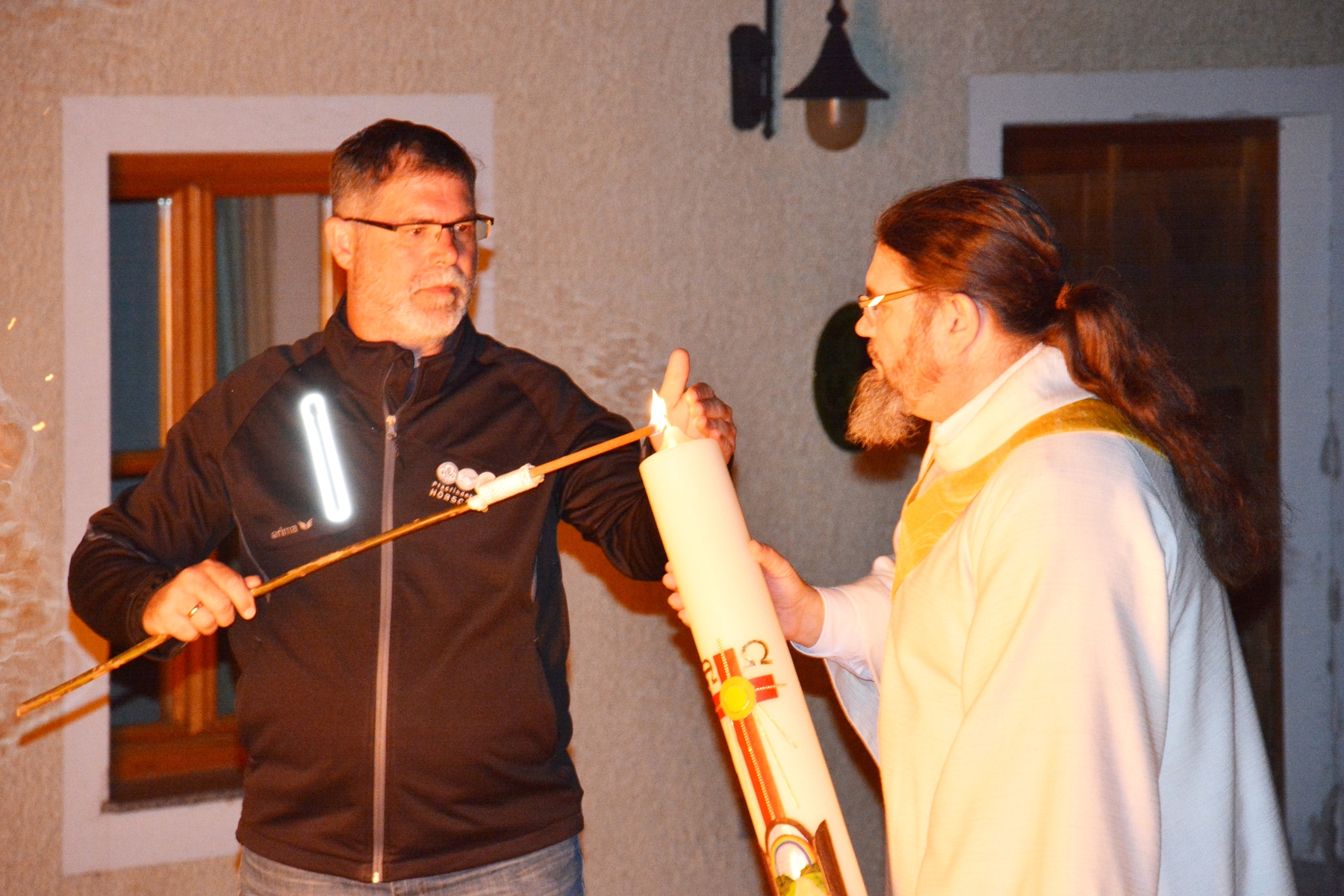 Die Pfadfinder haben das Lagerfeuer kunstvoll arrangiert und entzündet. Die Besucher:innen sind der brennenden Osterkerze durch den Friedhof gefolgt und in die dunkle Kirche eingezogen. Mit "Lumen Christi" sind Seelsorger Michael Steiner, Wortgottesdienstleiter Michael Pozar, die Ministrantinnen und Lektoren eingezogen. Danach wurde das Licht an die Gottesdienstbesucher weitergegeben.