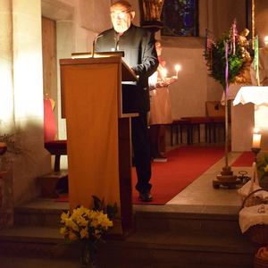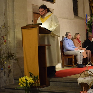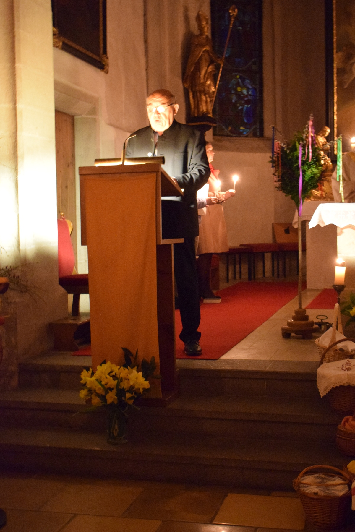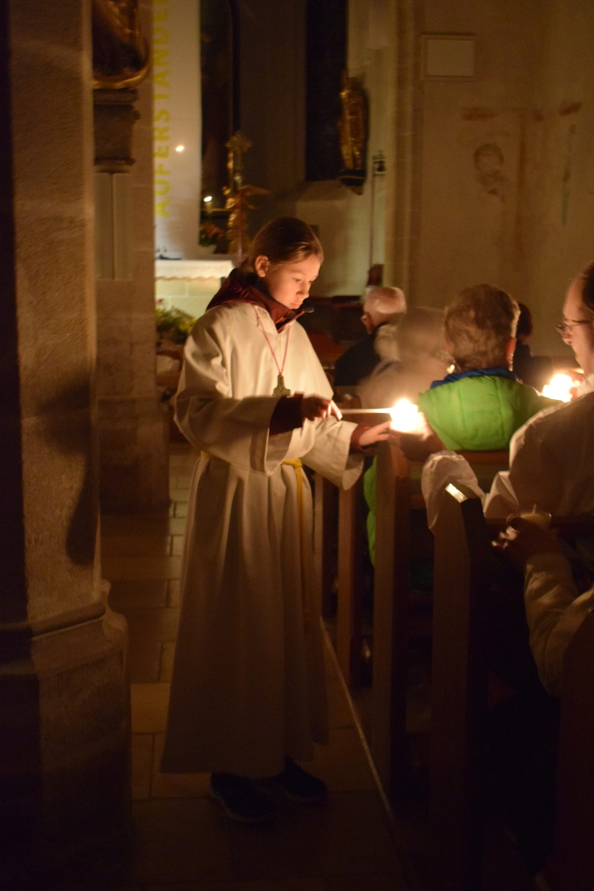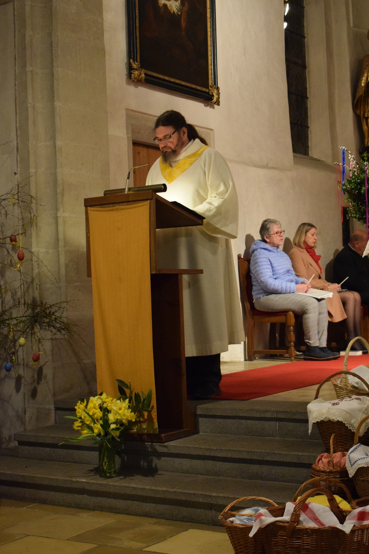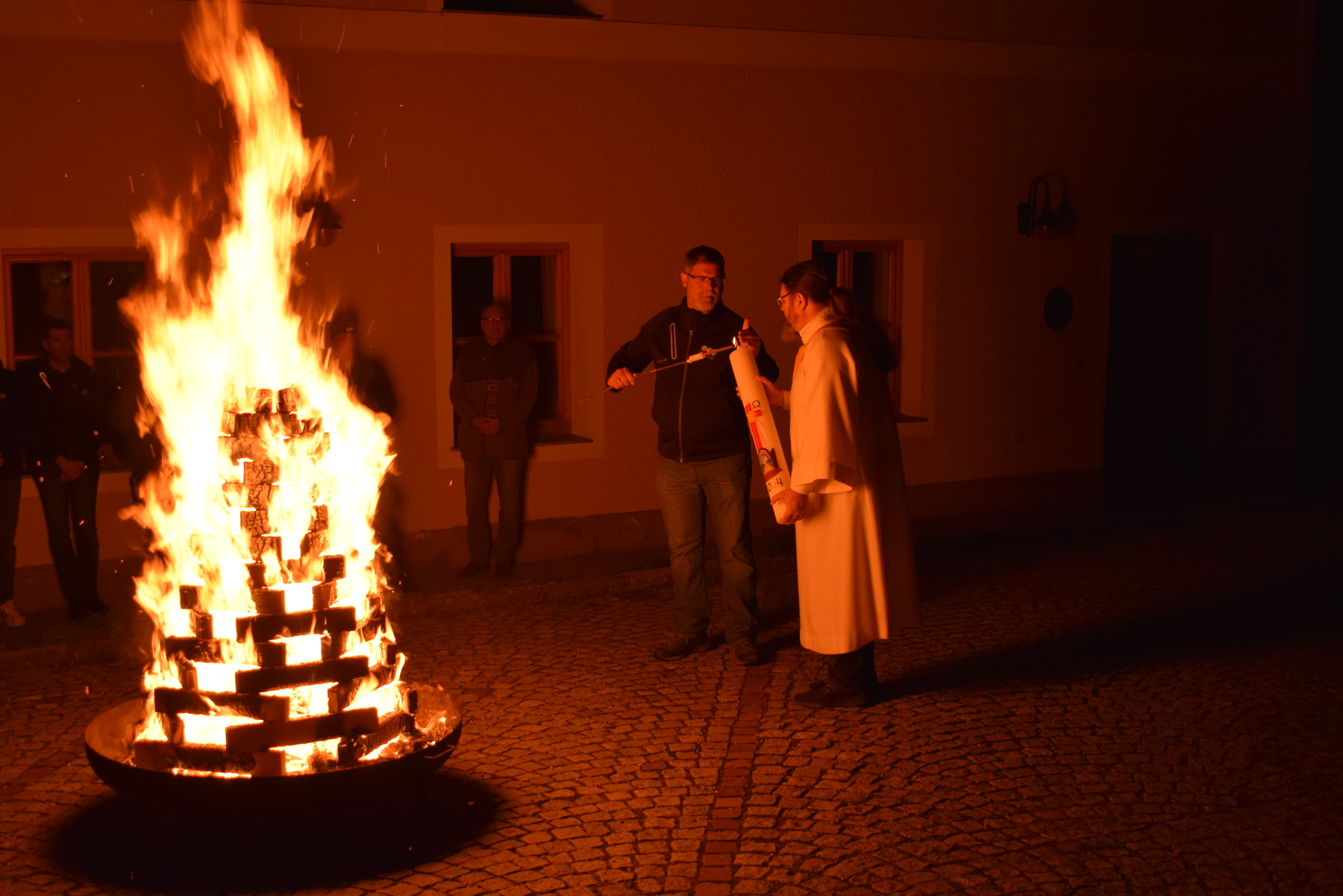 Die Pfadfinder haben das Lagerfeuer kunstvoll arrangiert und entzündet. Die Besucher:innen sind der brennenden Osterkerze durch den Friedhof gefolgt und in die dunkle Kirche eingezogen. Mit "Lumen Christi" sind Seelsorger Michael Steiner, Wortgottesdienstleiter Michael Pozar, die Ministrantinnen und Lektoren eingezogen. Danach wurde das Licht an die Gottesdienstbesucher weitergegeben.