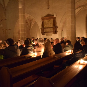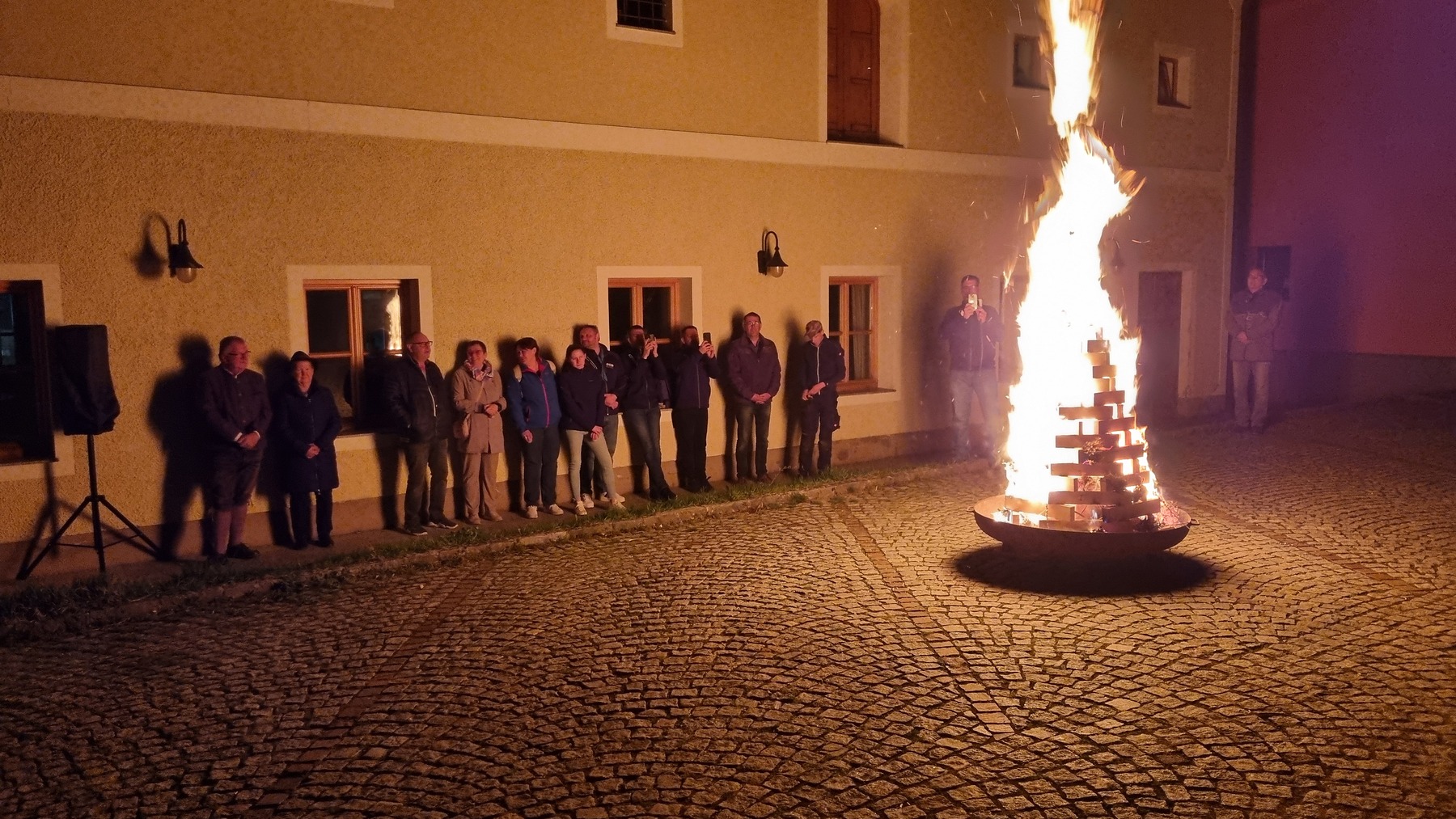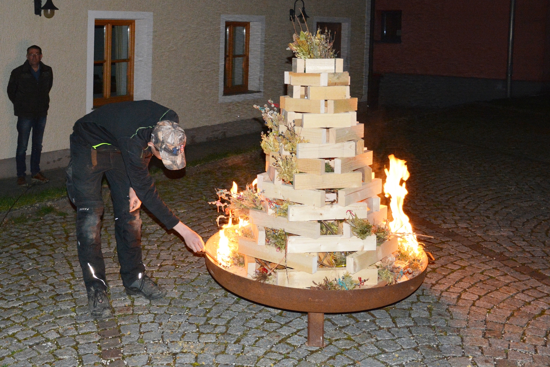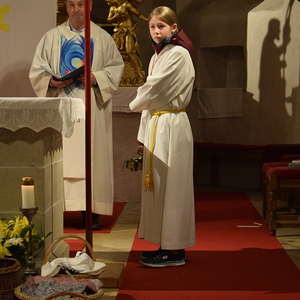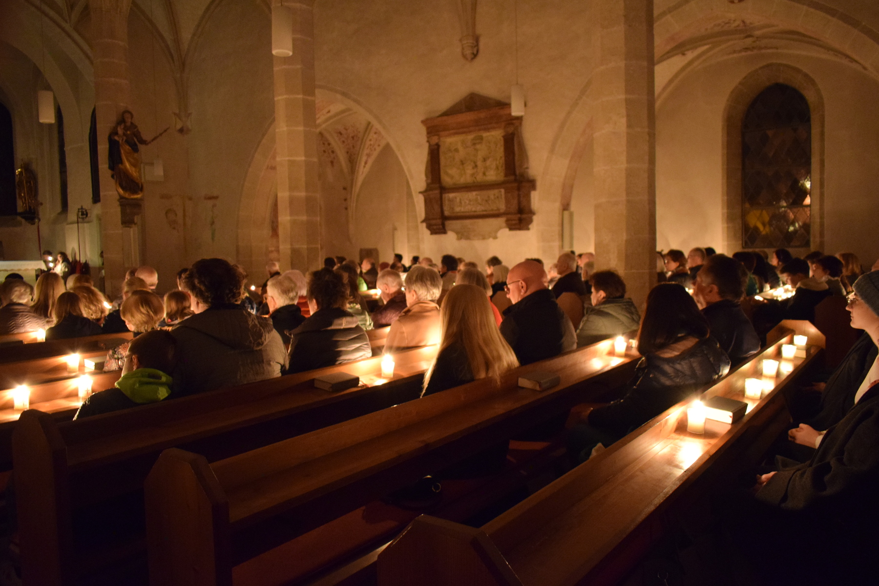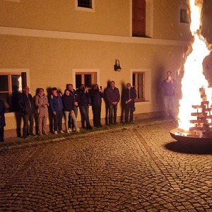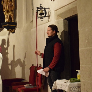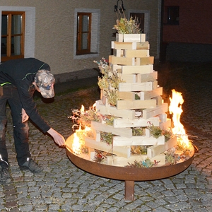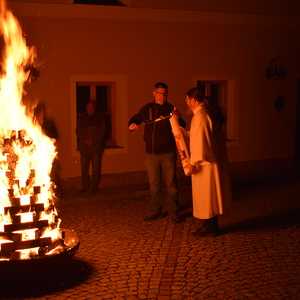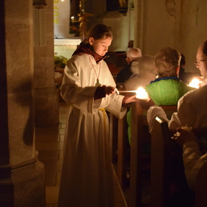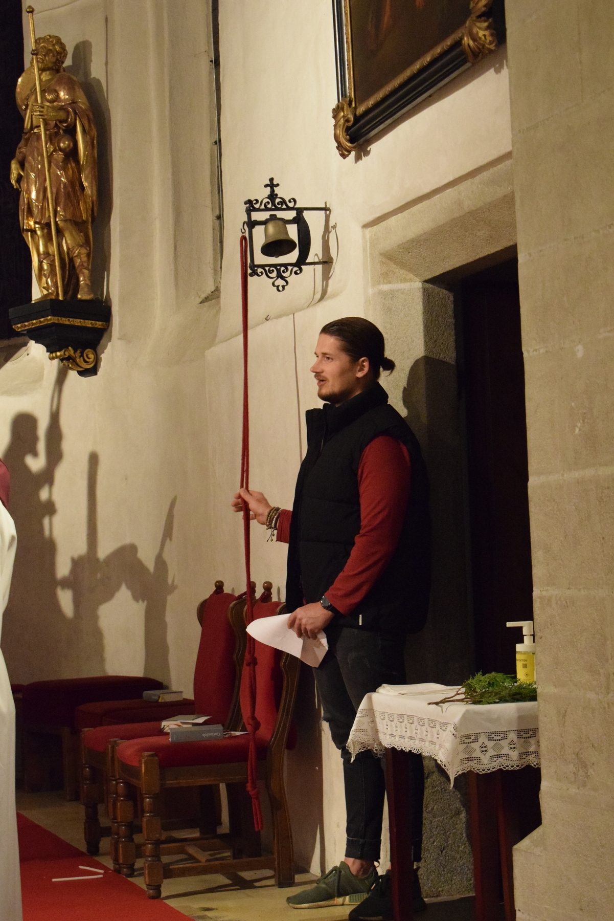 Die Pfadfinder haben das Lagerfeuer kunstvoll arrangiert und entzündet. Die Besucher:innen sind der brennenden Osterkerze durch den Friedhof gefolgt und in die dunkle Kirche eingezogen. Mit "Lumen Christi" sind Seelsorger Michael Steiner, Wortgottesdienstleiter Michael Pozar, die Ministrantinnen und Lektoren eingezogen. Danach wurde das Licht an die Gottesdienstbesucher weitergegeben.