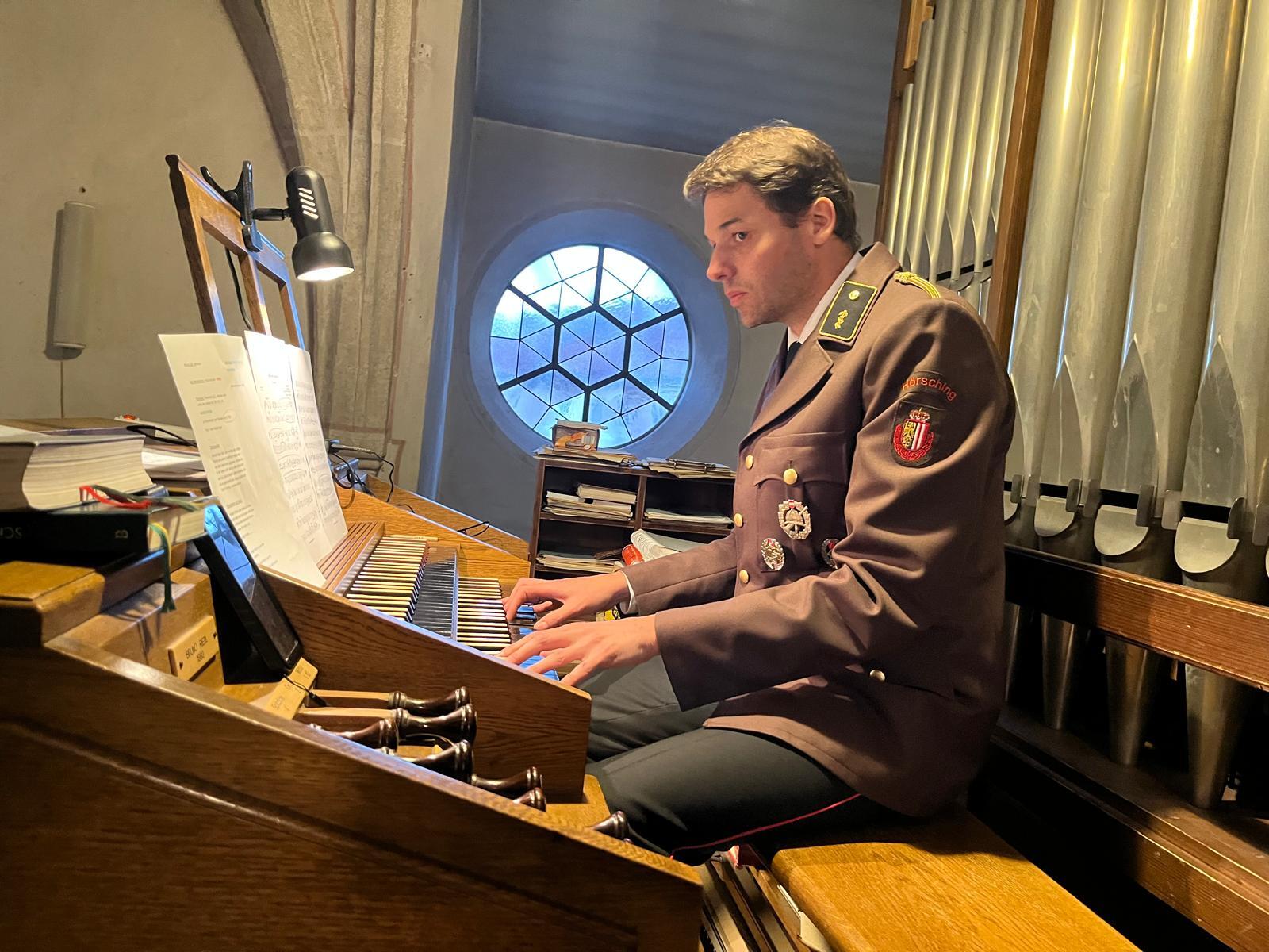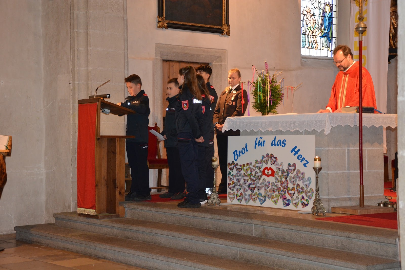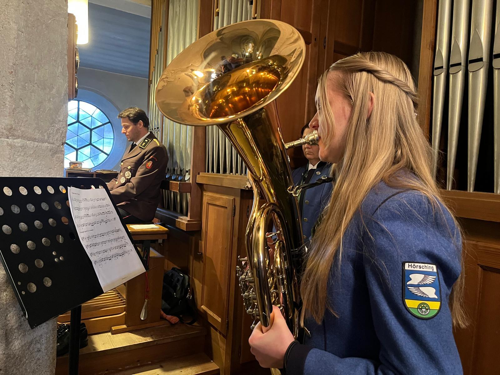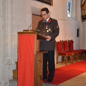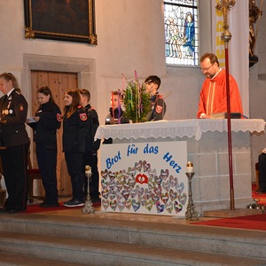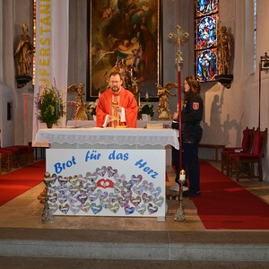 Kaplan Peter Ramsebner zelebrierte die Messe, der Nachwuchs der Feuerwehren formulierte und verlas die Fürbitten. Unser Organist, Michael Windner, selbst Feuerwehrmitglied kam ins Schwitzen: Neben dem Orgelspiel programmierte er die Nummern für die Liederanzeige und dirigierte erstmals den Musikverein mit ganzem Körpereinsatz, da Kapellmeister Helmut Schmitz und sein Stellvertreter Horst Salamonsberger beide verhindert waren. Vielen Dank!