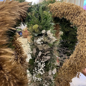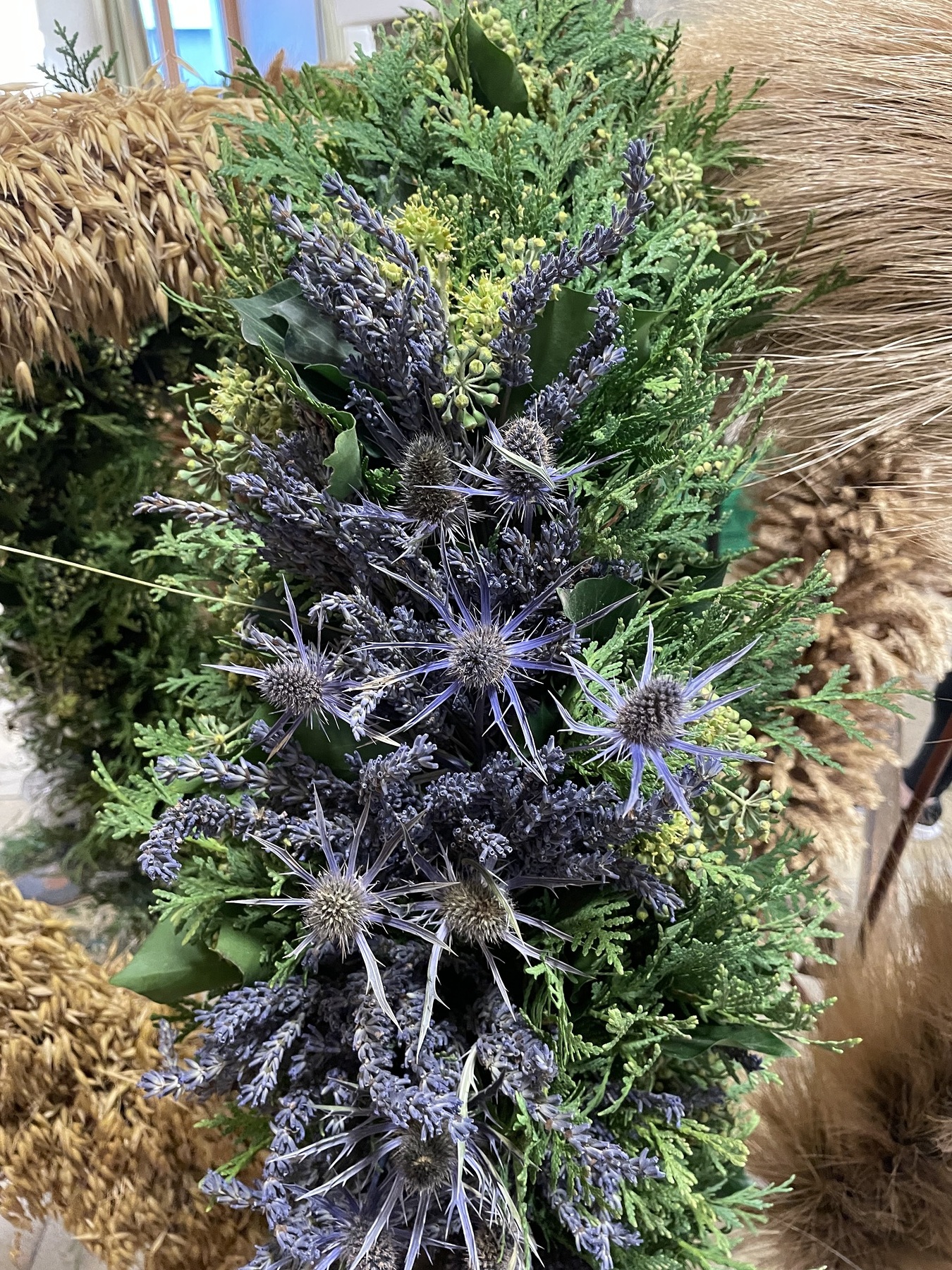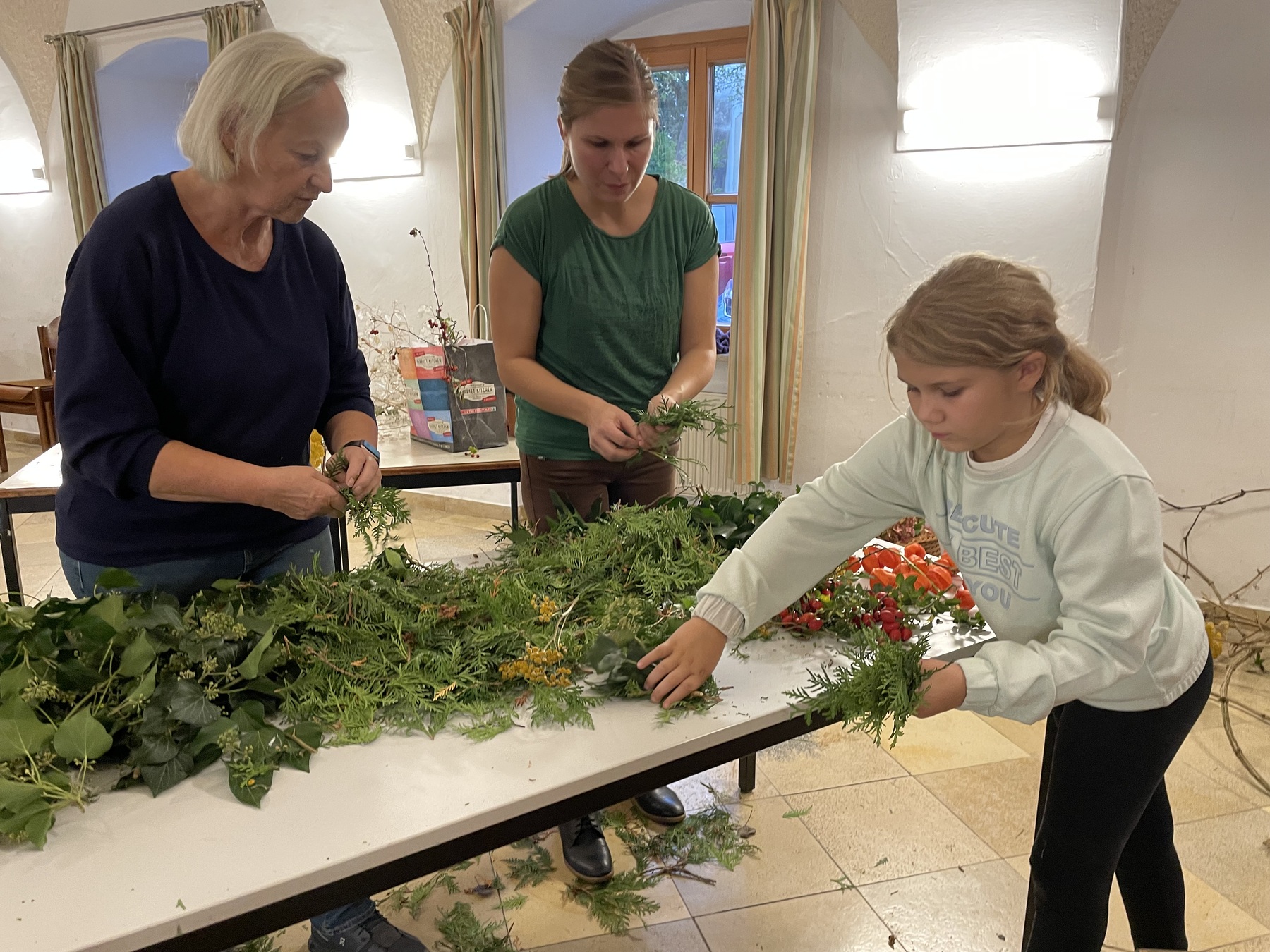 Sonne, Mond und Sterne, der Wind, das Wasser, das Feuer, die Liebe und der Tod wurden farblich in der Erntedankkrone abgebildet.