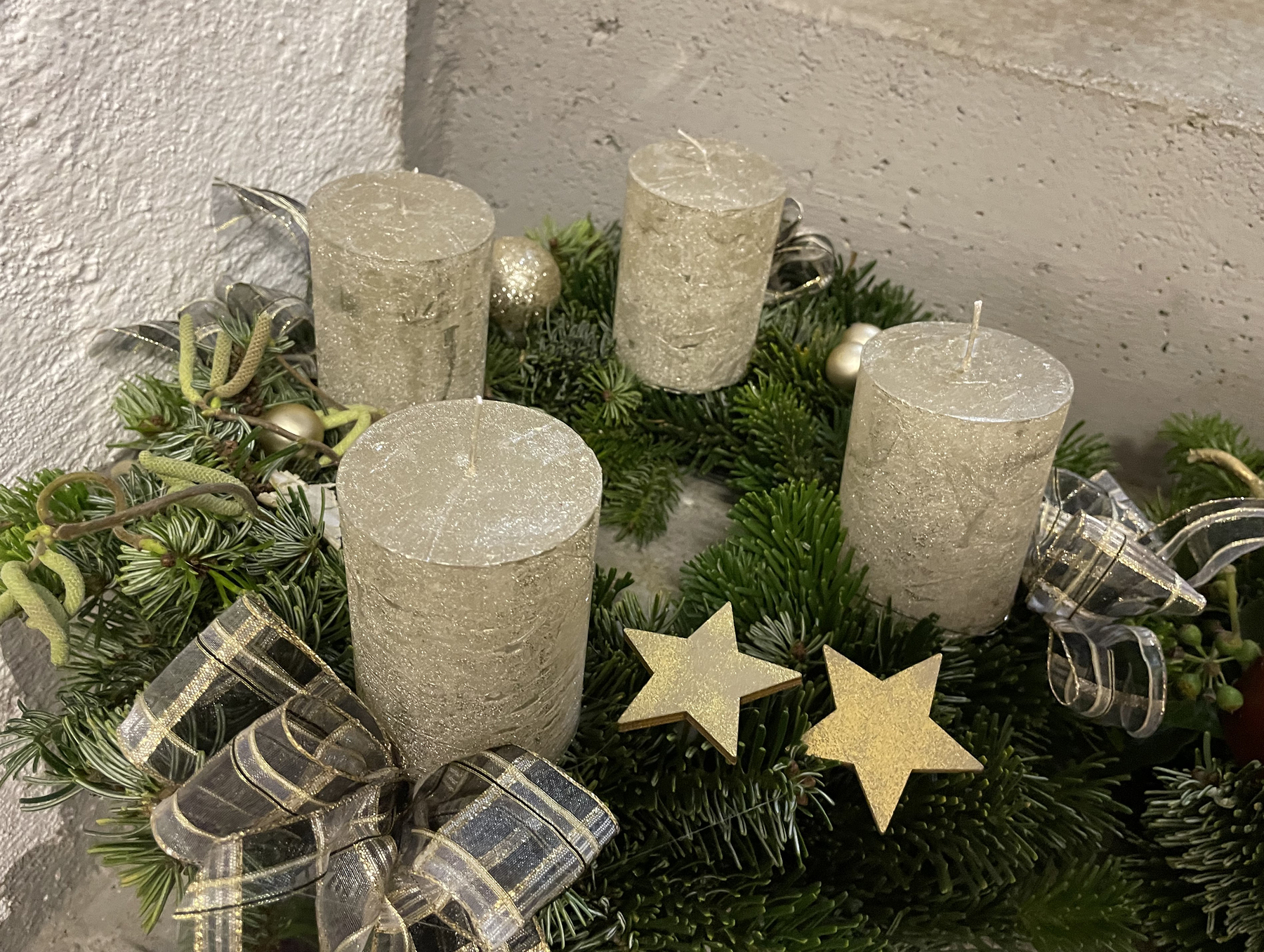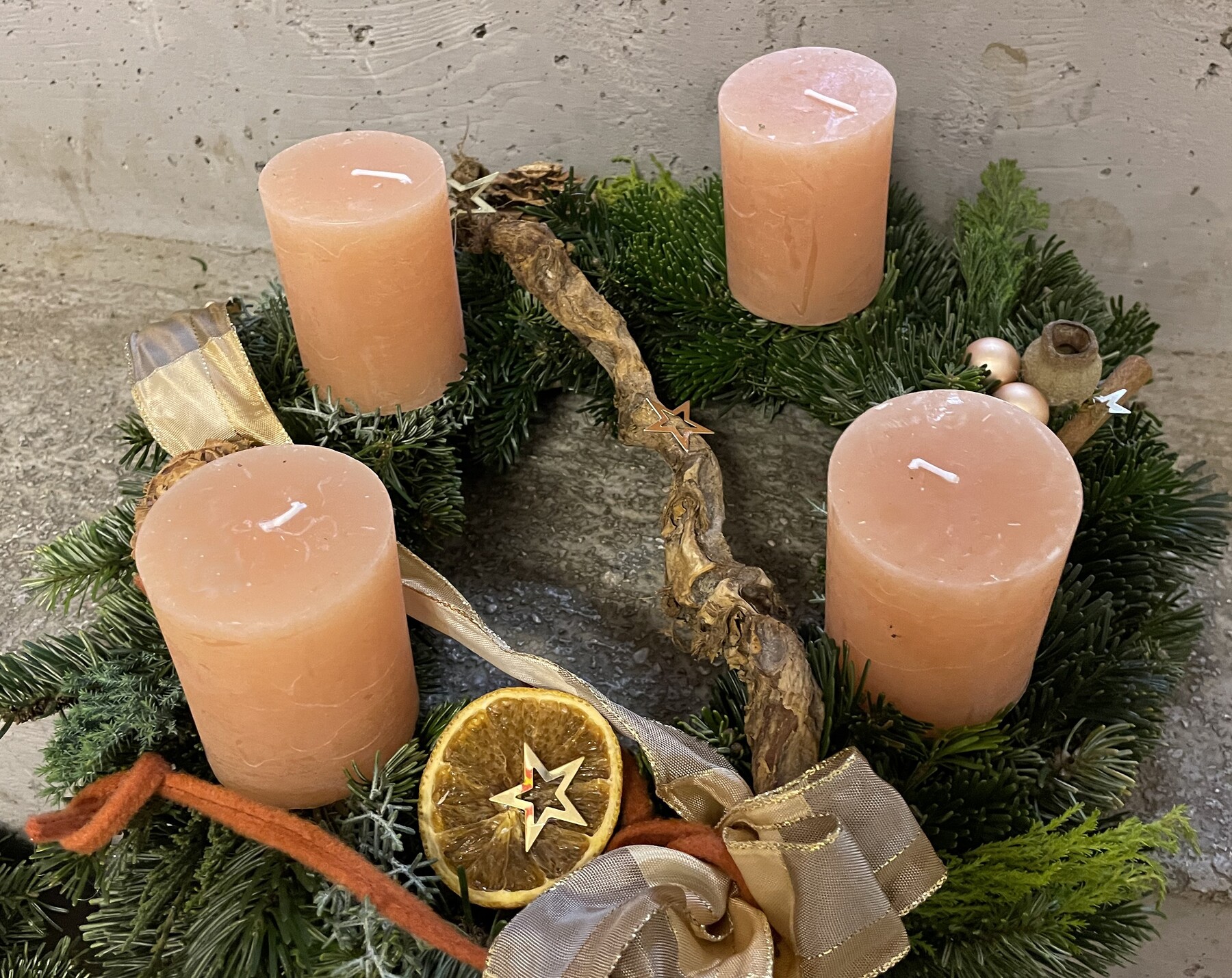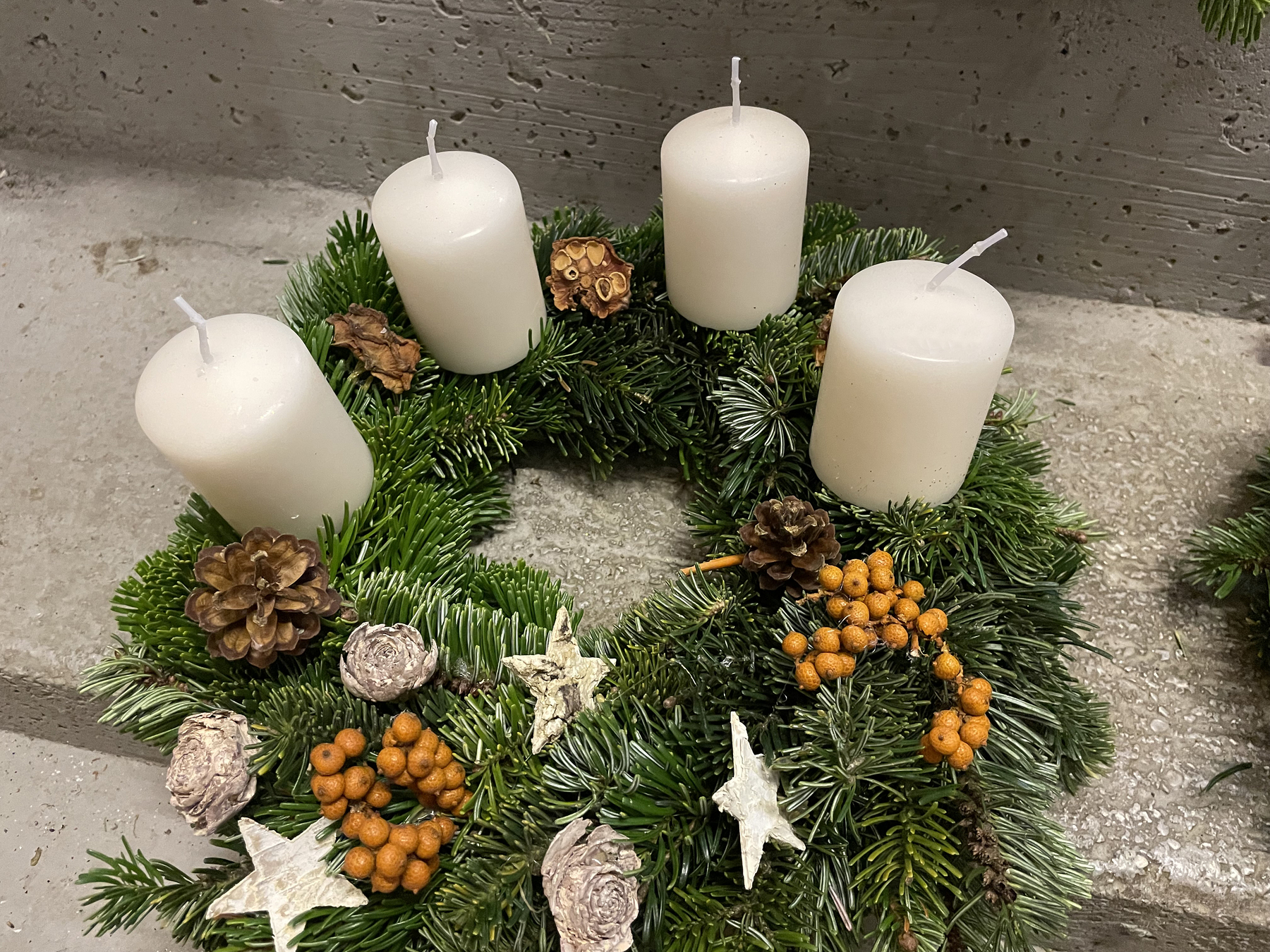 Am Wochenende wurde eine riesige Tanne bei Familie bei Eberhard gefällt und das Reisig für die Kränze verwendet, Naturmaterialien wurden gesammelt oder in den Gärten abgeschnitten.
