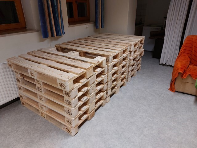 Diese wurden Ende Oktober von der Spedition Dachser Austria GmbH angeliefert und in einer ersten Abendaktion von zwei Vätern der Minis und mir bearbeitet und geschliffen. An einem weiteren Abend fügten wir die einzelnen Paletten zu Sitzmöbel zusammen.