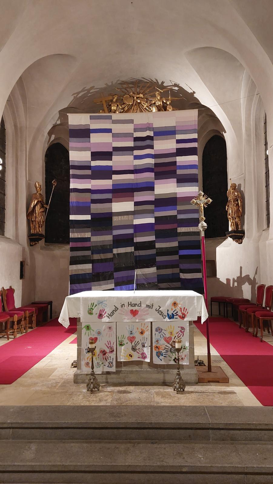 Wie sich die Farben des Fastentuches wandeln – entsprechend der Fastenzeit vom Schwarz/Grau der Asche des Aschermittwochs über unterschiedliche Töne der liturgischen Farbe Violett für die Fastenzeit bis zum Rosa des Laetare-Sonntags und dem Weiß für das Osterfest – so wandelt sich auch unser Leben in jeder Situation, wenn „Vater unser“ – Bitten Wirklichkeit werden.