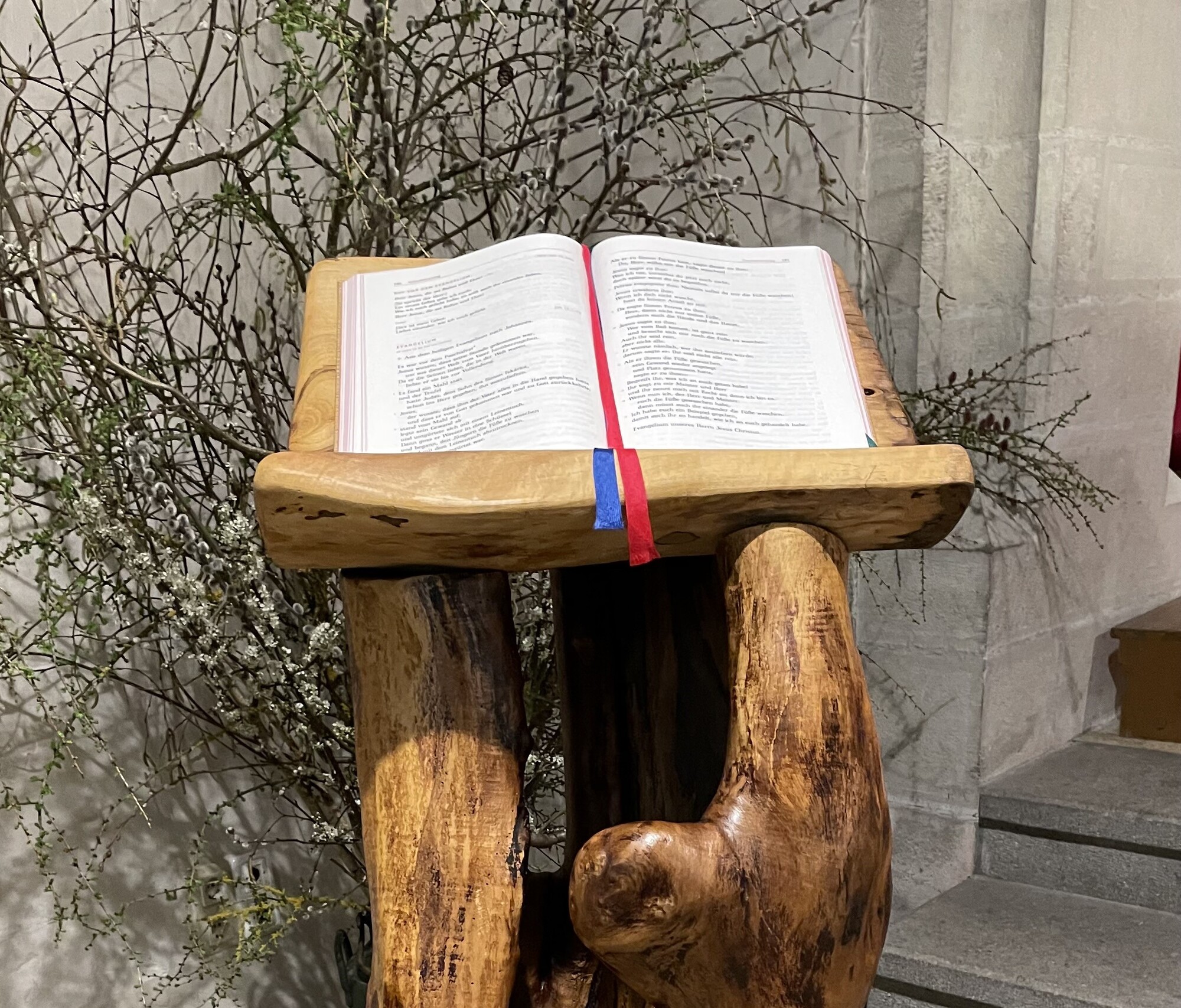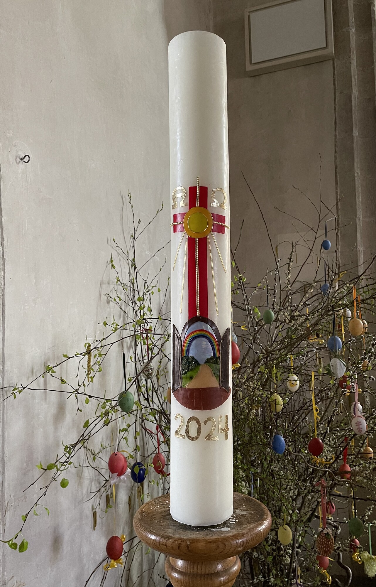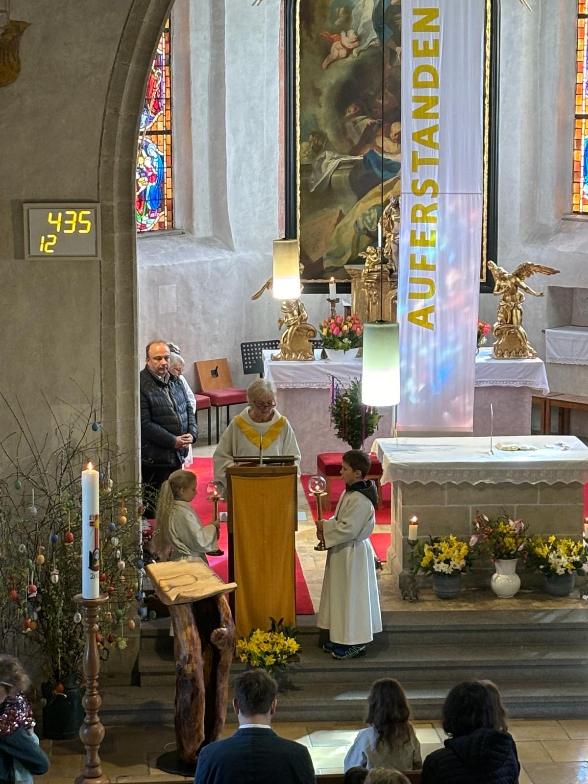 Der Gottesdienst am Ostermontag wurde als Wortgottesfeier gefeiert. Der neue Osterbanner hat das kunstvolle Fastentuch der Fastenzeit bereits in der Osternacht abgelöst, aber heute hat die Sonne den Banner so richtig zum Leuchten gebracht.