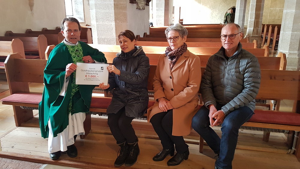 Susi Skoda übergibt im Namen der Goldhaubenfrauen Hörsching eine Spende von € 1000,-- an P. Carlos und Erwin Pal (Obmann Finanzasschuss) als Zuschuss für die neuen komfortablen Sitzauflagen in der Kirche.