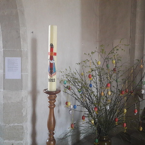 Die Gestaltung der Osterkerze ist ein beeindruckendes Glaubenszeugnis von Gertraud Haberler und strahlt im wahrsten Sinn des Wortes hinein in unsere Pfarre. – Danke!