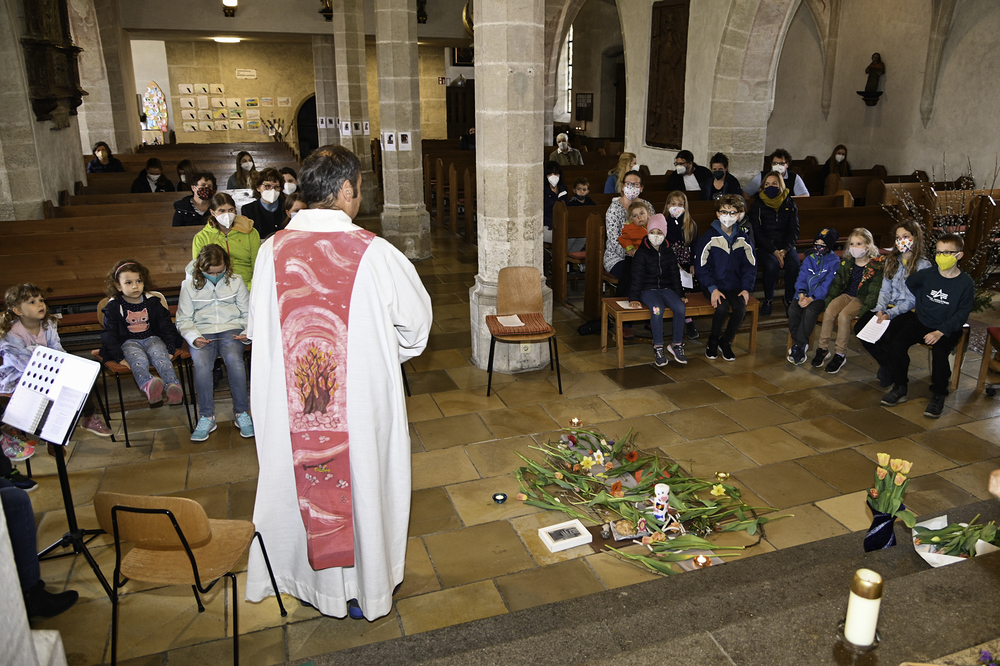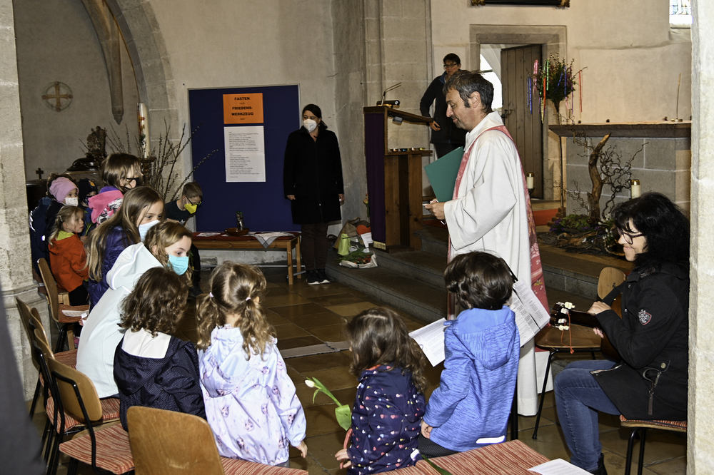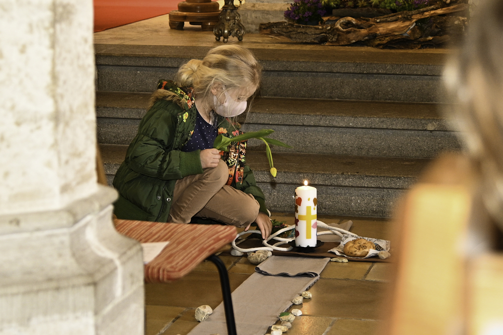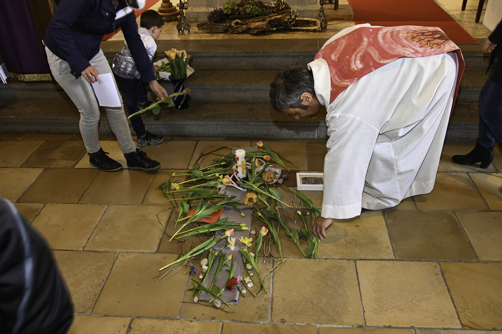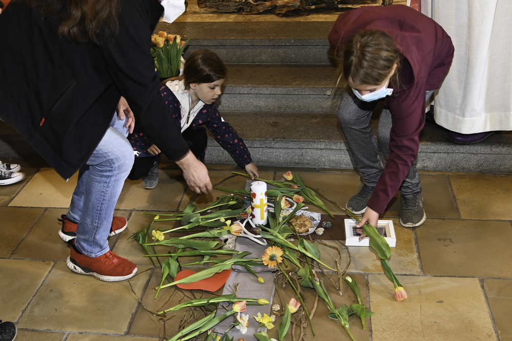 Am Nachmittag des Karfreitags begleiteten Kinder, Jugendliche und Erwachsene Jesus auf seinem letzten Weg: vom Einzug in Jerusalem bis zu Tod am Kreuz und Grablegung. Mit Worten, Liedern und Symbolen konnten sie sich hineinversetzen in die Höhen und Tiefen unseres Lebens, die sich in Jesus wie in einem Brennpunkt verdichten.