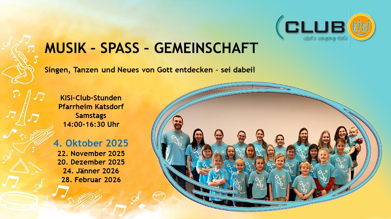 Wir treffen uns einmal im Monat im Pfarrheim und verbringen zweieinhalb Stunden miteinander. Musik ist ein einzigartiges Geschenk und bewegt die Herzen. Deshalb wollen wir durch Musik, Tanz und Schauspiel biblische Geschichten sichtbar und erlebbar machen. Jede Stunde gibt es ein Thema, das wir gemeinsam erarbeiten. Wir singen und tanzen zu KISI-Liedern, beten miteinander, jausnen zusammen und haben jede Menge Spaß bei vielen lustigen Spielen. Wer zu uns kommt, darf Gemeinschaft erleben und Gott entdecken. 3-4 Mal im Jahr gestalten wir einen Gottesdienst, um das Gelernte, die Gute Nachricht, an andere Menschen weiterzugeben.