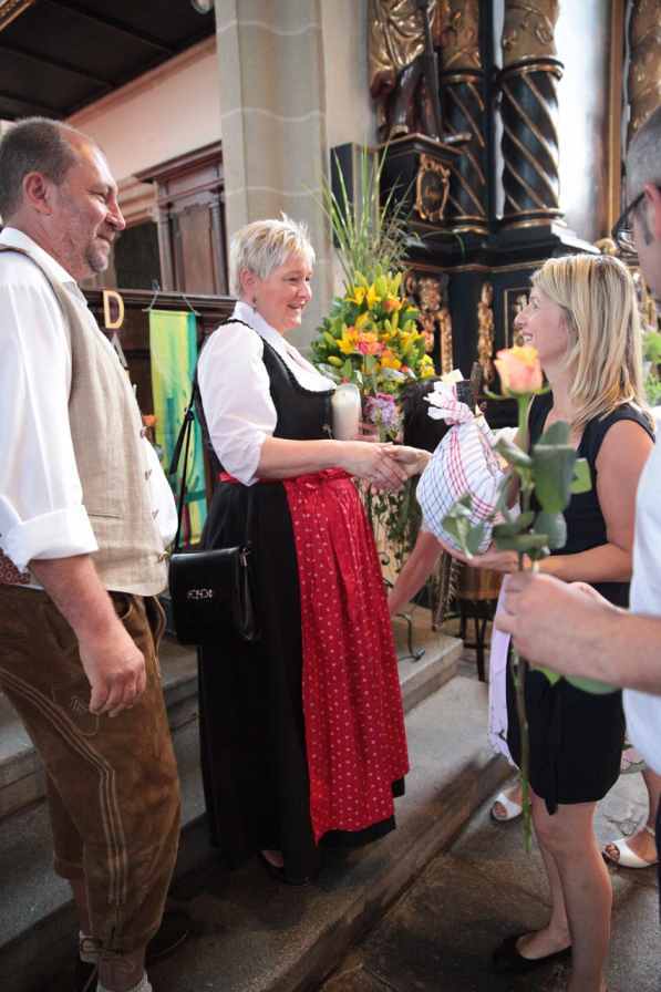 Mitarbeiterinnen des Fachausschusses „Beziehung leben“ überreichten im Anschluss an den Gottesdienst den Jubelpaaren ein „Bschoadpinkerl“ mit Wein, Brot, einer Rose und einem Wunsch für die kommenden Jahre. Zum Ausklang lud der Fachausschuss die Paare mit ihren Familien zur Agape ins Pfarrheim ein, während die anderen Mitfeiernden den Sonntagvormittag bei Blasmusik, Essen und Trinken ausklingen lassen konnten.