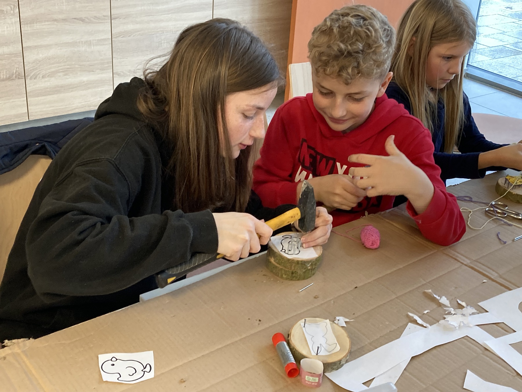 Dazu wurde ein Ostermotiv auf eine Astscheibe geklebt, die Umrisse genagelt und anschließend die Fläche mit Wolle ausgefüllt.