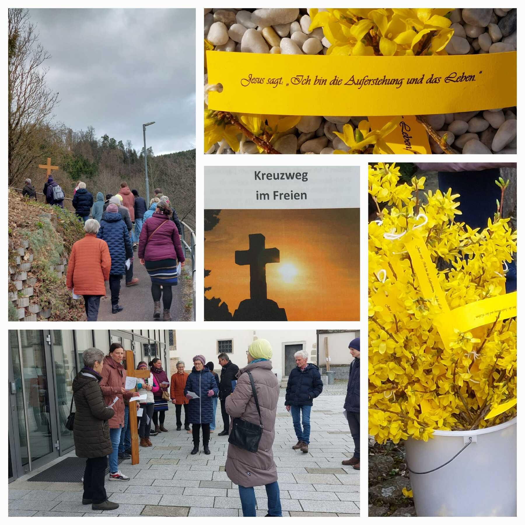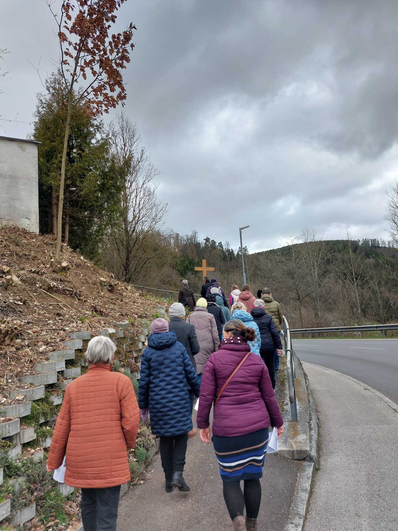 Am Palmsonntagnachmittag steht das traditionelle Kreuzweg gehen im Freien an. Um 15 Uhr machten sich einige auf den Weg durch den Ort. So wurde der Kreuzweg in diesem Jahr aus der Sicht Jesu gegangen. Auch das Wetter unterstrich die Stimmung des Kreuzwegs. So wurden die Betenden von Wind und letztlich auch Regen bis zur letzten Station begleitet. Passend zur Rede über die Hoffnung auf ein Leben nach dem Tod, lichtete sich der Himmel und bescherte Sonnenstrahlen.