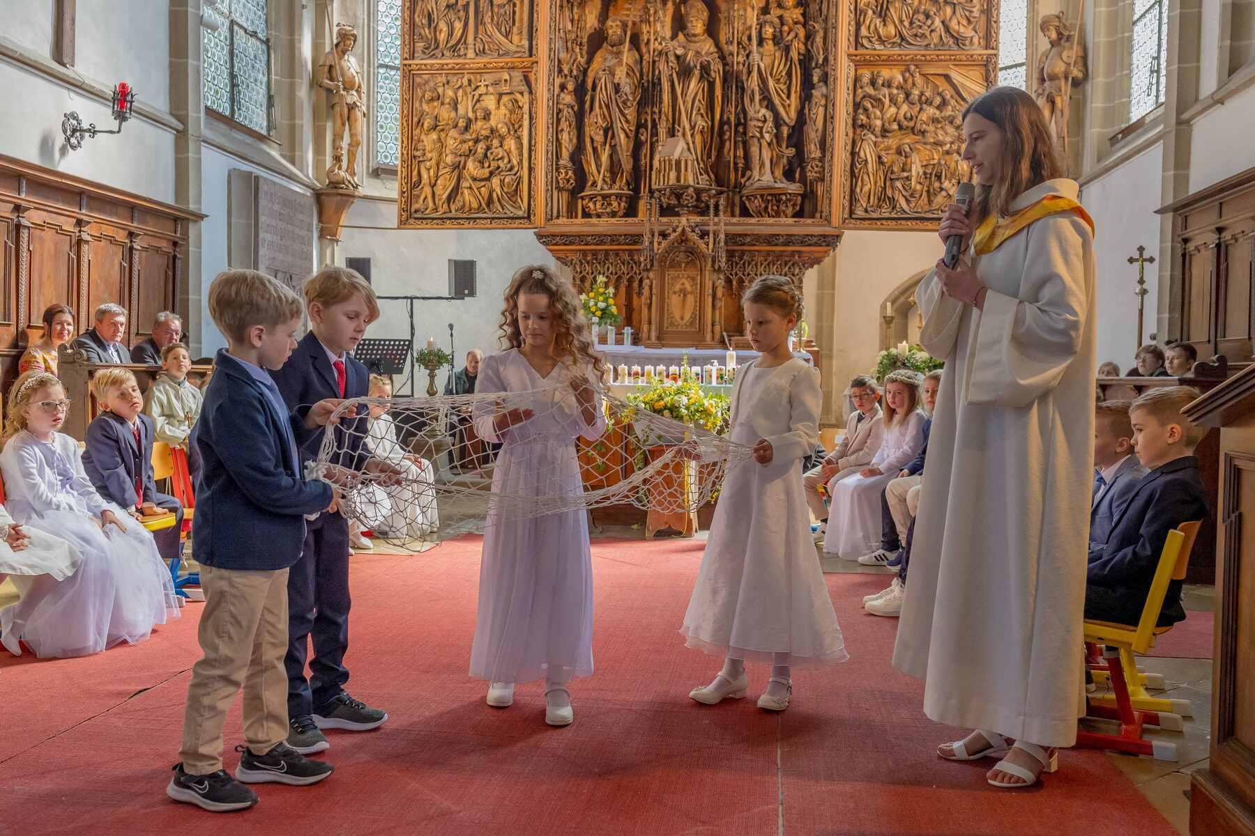 Mit Jesus in einem Boot war das Thema der Vorbereitung. Im großen Boot der Gemeinschaft der Christ:innen sitzen wir bereits seit der Taufe. Bei der Erstkommunion geht es um ein tieferes Hineinwachsen in diese Gemeinschaft denn: Der Glaube lebt von den Menschen, die bei Jesus im Boot sind!