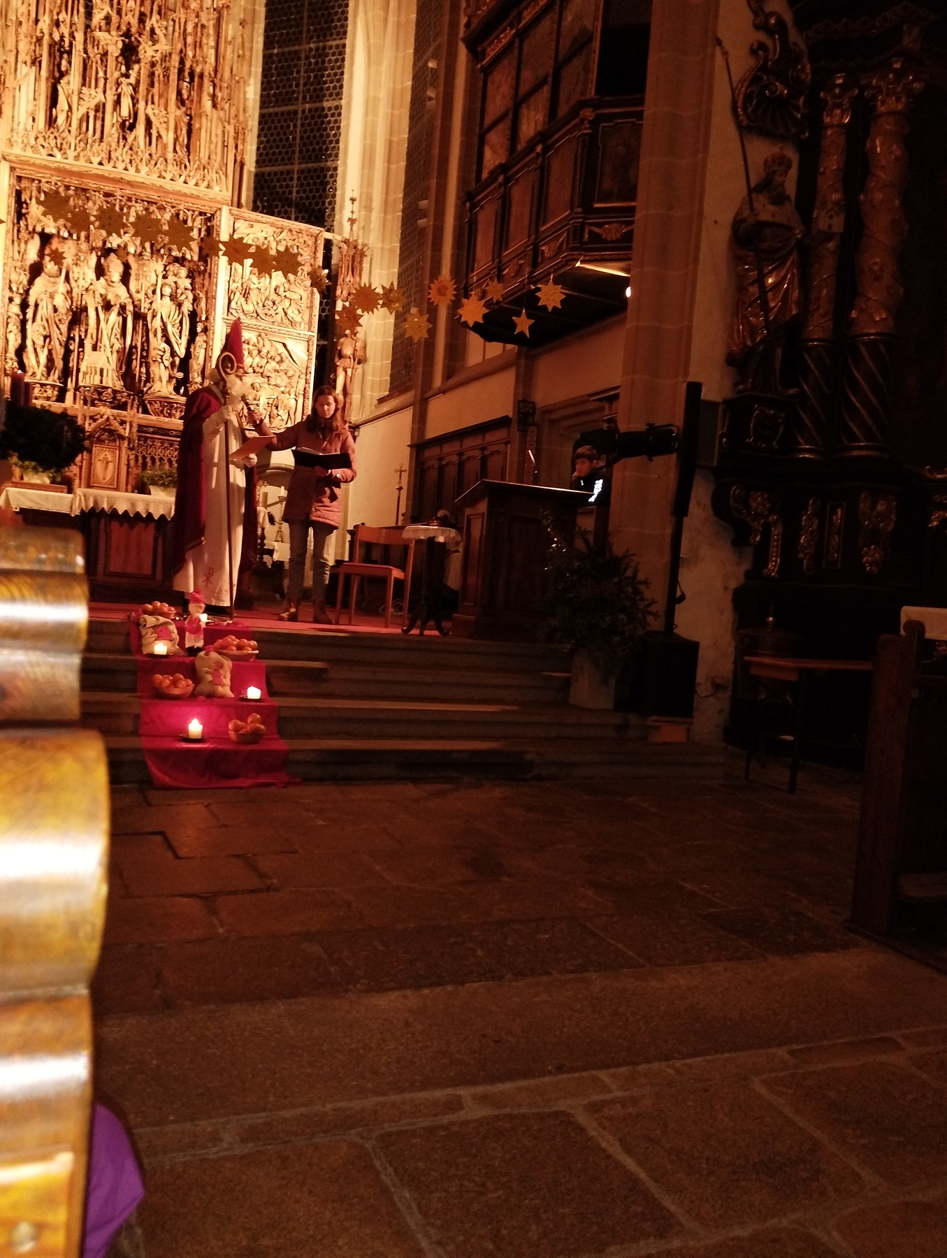 Doch es hat ein wenig gedauert, bis Nikolaus den Weg in die Kirche fand. Mithilfe der Kinder wussten wir zumindest, auf welche äußerlichen Merkmale wir achten mussten: Bischofsstab, Sack, Mütze, rotes oder weißes Gewand, langer Bart. Aber weit und breit war kein Nikolaus zu sehen.