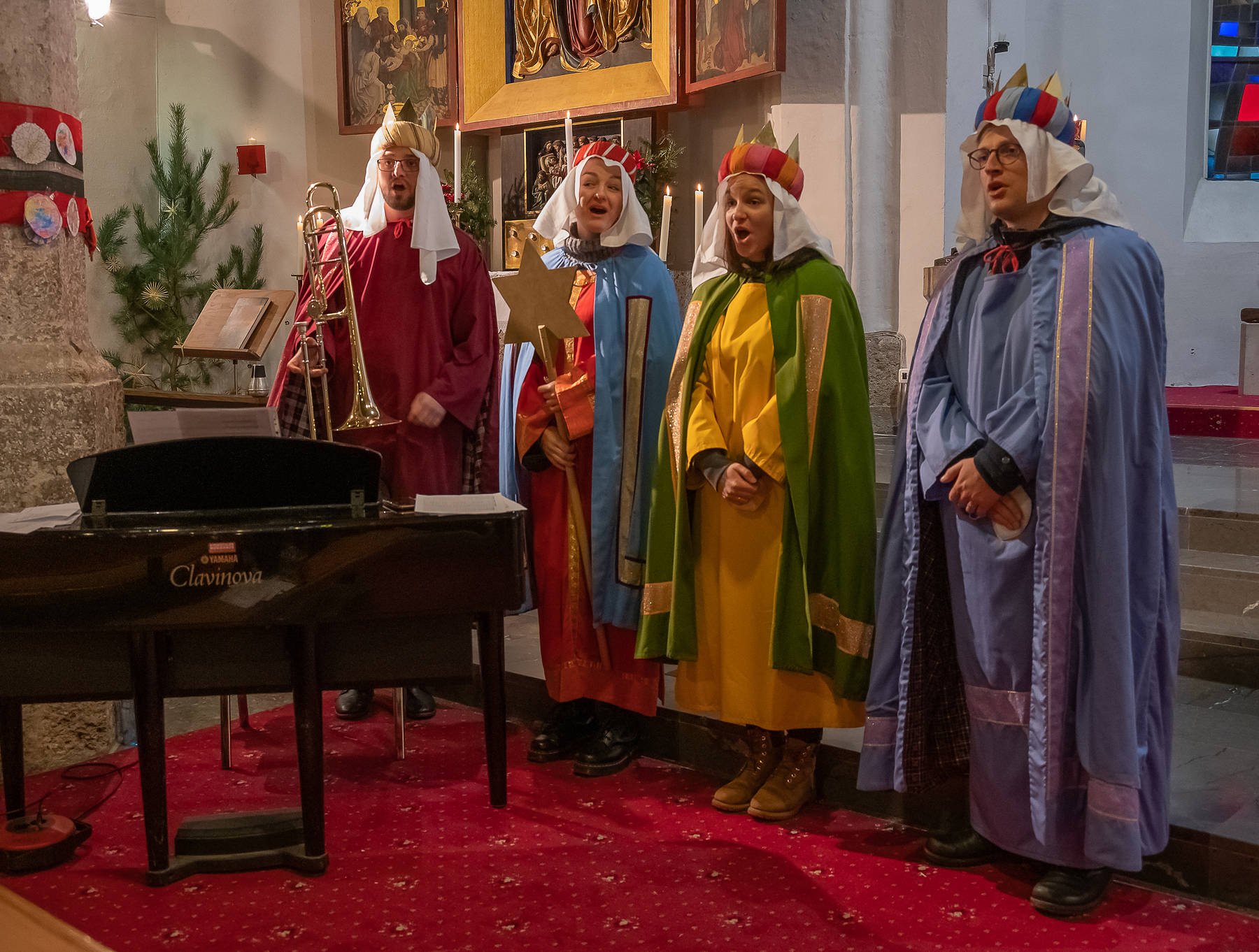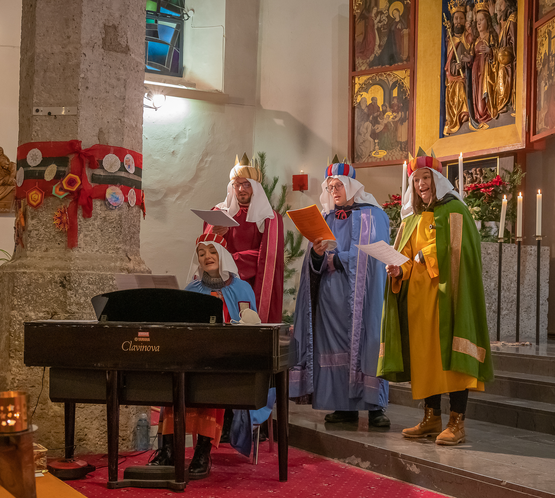Am ersten Sonntag im Neuen Jahr wurden die Mitfeiernden des Gottesdienstes mit besonderen Klängen beschenkt: Die Musikerin Anna-Maria Schnabl (AMS), ihre Schwester Katharina mit Mann Simon Schwingenschuh sowie Martin Gegenleitner waren in Kirchdorf als Sternsinger unterwegs. Vor den Besuchen der Häuser sorgten sie für die musikalische Umrahmung der Frühmesse. Simon Schwingenschuh spielte am Beginn und Ende der Feier auf der Posaune, das Quartett sang Lieder, die Anna-Maria Schnabl am Clavinova begleitete. „Danke für dieses wunderschöne Geschenk, für eure Musik“, bedankte sich Pfarrer P. Severin Kranabitl, dem sich die Mitfeiernden mit einem großen Applaus anschlossen. Anschließend zog die Gruppe los, um den Segen zu den Häusern zu bringen und für die Dreikönigsaktion zu sammeln.