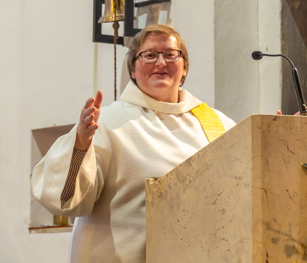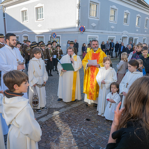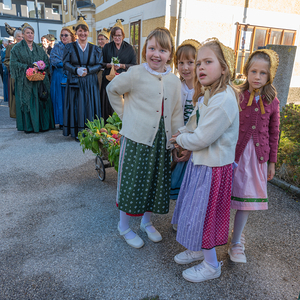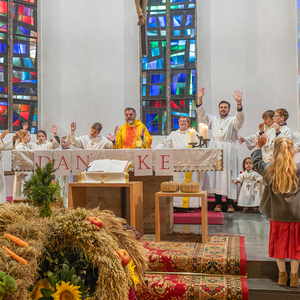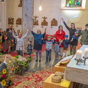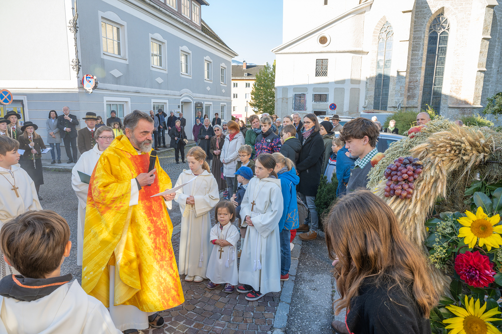 Die Feier begann vor dem Pfarrhof mit einem Danke-Gebet. "Wir richten unsere Aufmerksamkeit bewusst auf das Gelingende in unserem Leben und auf all das, was uns geschenkt wird. Jeden Tag haben wir Grund, Gott für all das zu danken, was wir zum Leben haben.", darauf wies Pastoralassistentin Ulrike Steinmaurer bei ihren einführenden Worten hin. Pfarrer P. Severin Kranabitl segnete die Erntekrone, gebunden von Beate Huemer und Maria Ullner. Dann zogen die Teilnehmenden in die Kirche zum festlichen Gottesdienst, bei dem Kinder das Evangelium spielerisch darstellten.