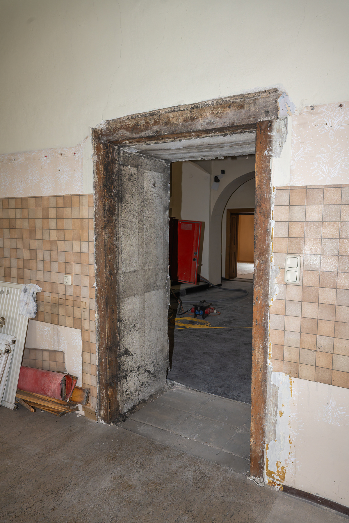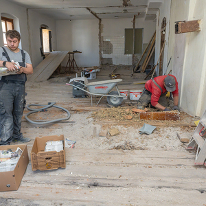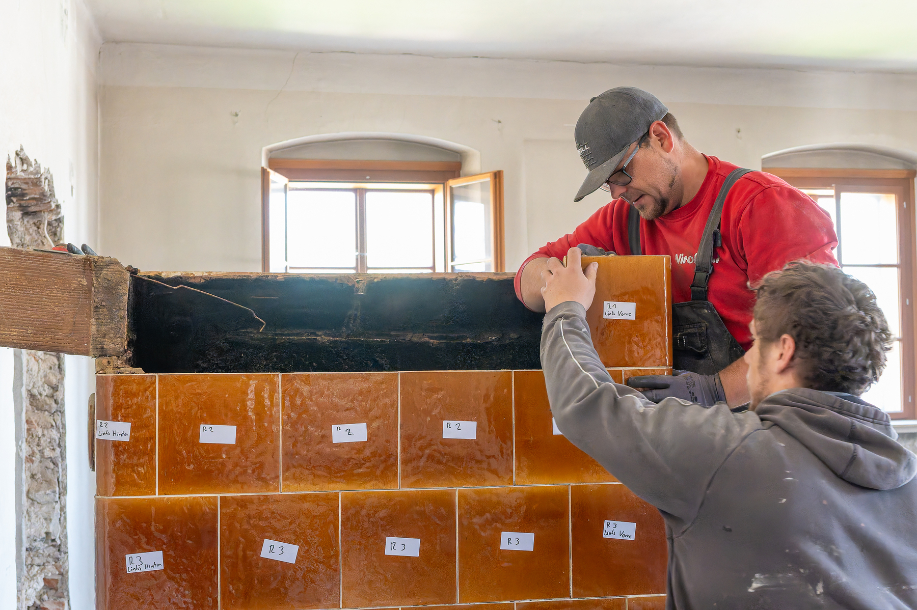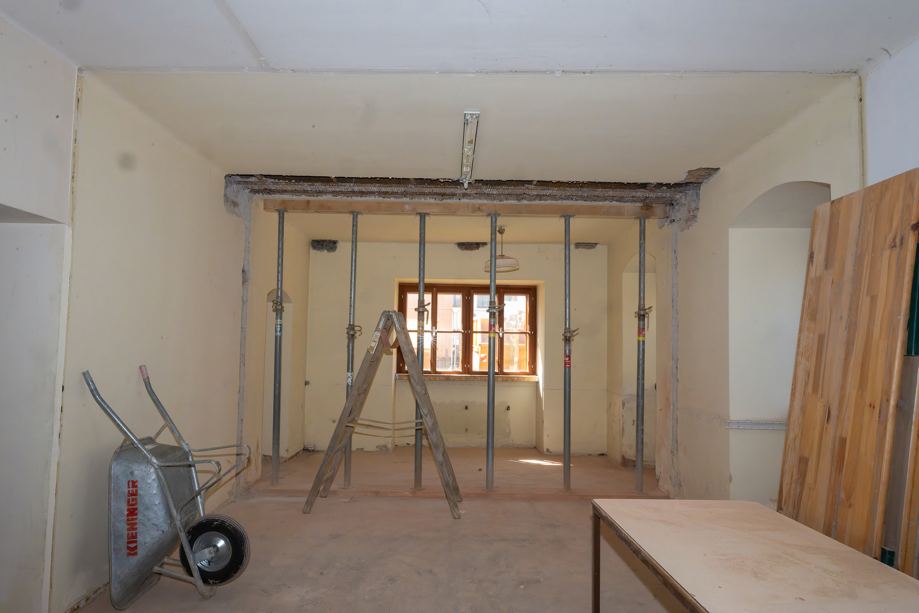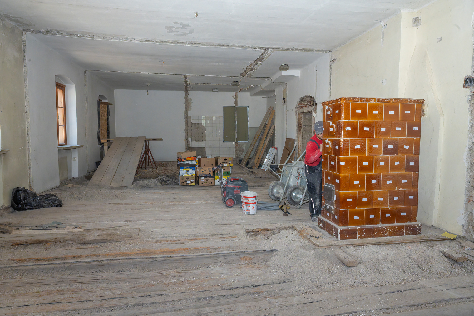 Dabei wurden zuerst die Mauern herausgeschlagen, um anschließend den Boden zu entfernen. Wie geplant, musste dieser aus statischen Gründen und damit auch die Decke des 1. Obergeschoßes unterhalb des Saals herausgerissen werden. Dafür wurde zuvor der denkmalgeschützte Ofen fachmännisch abgetragen.