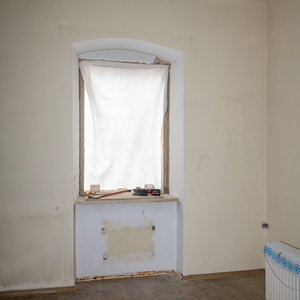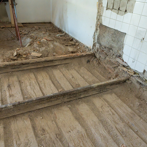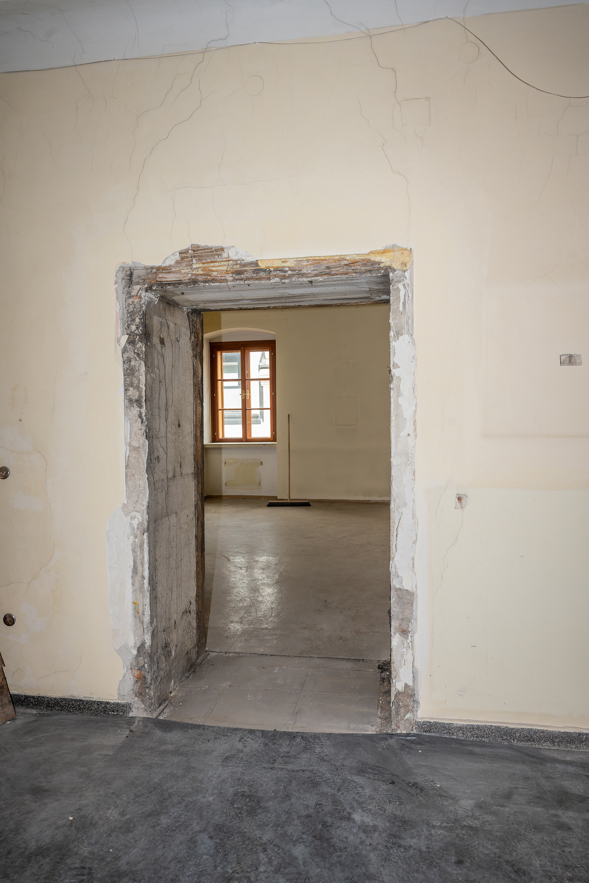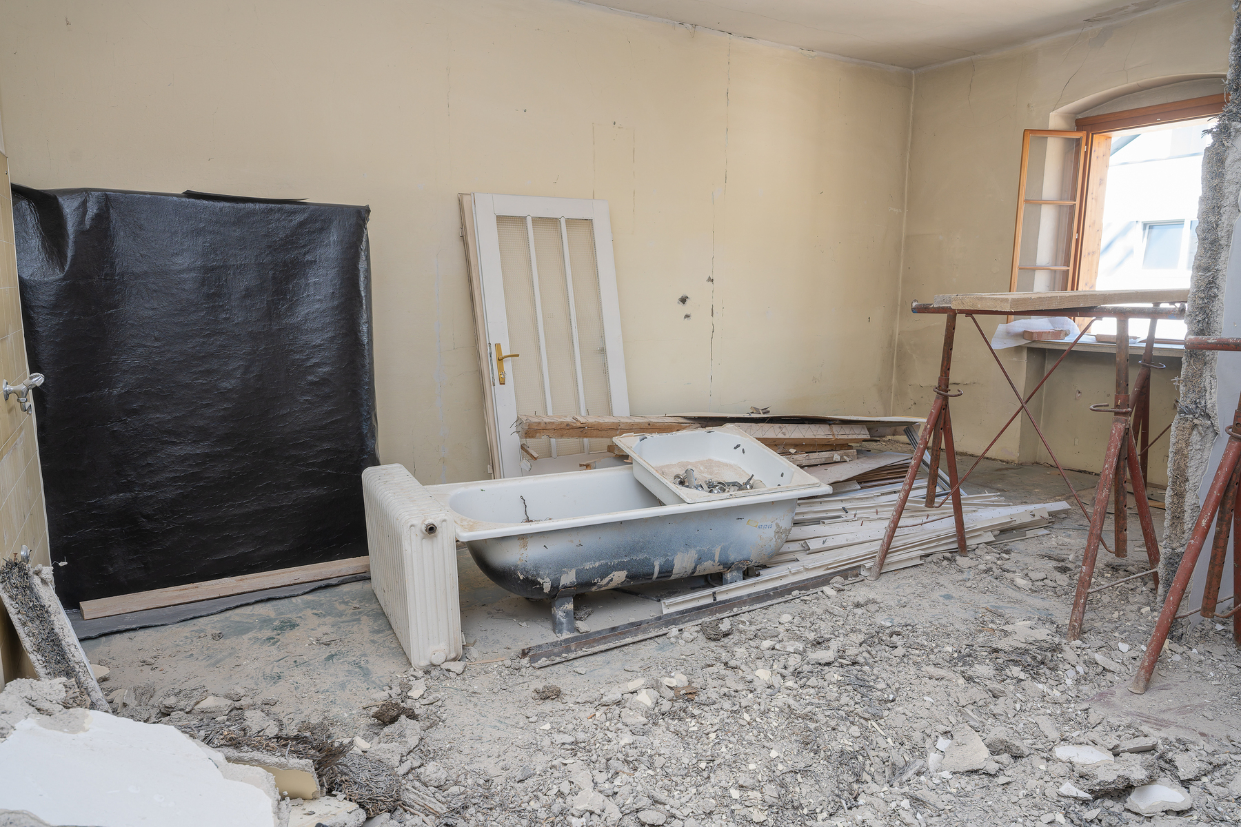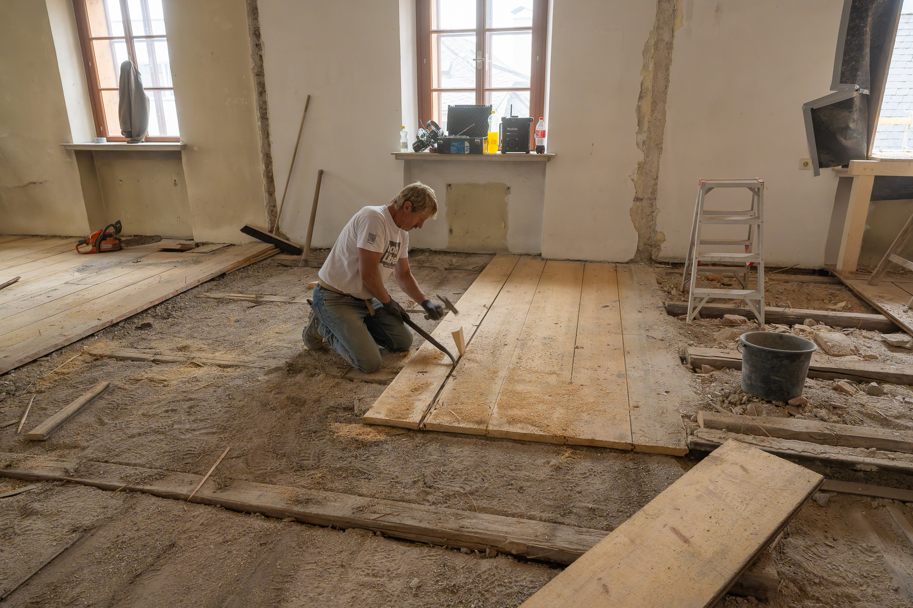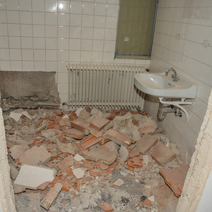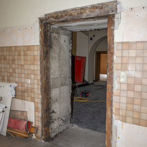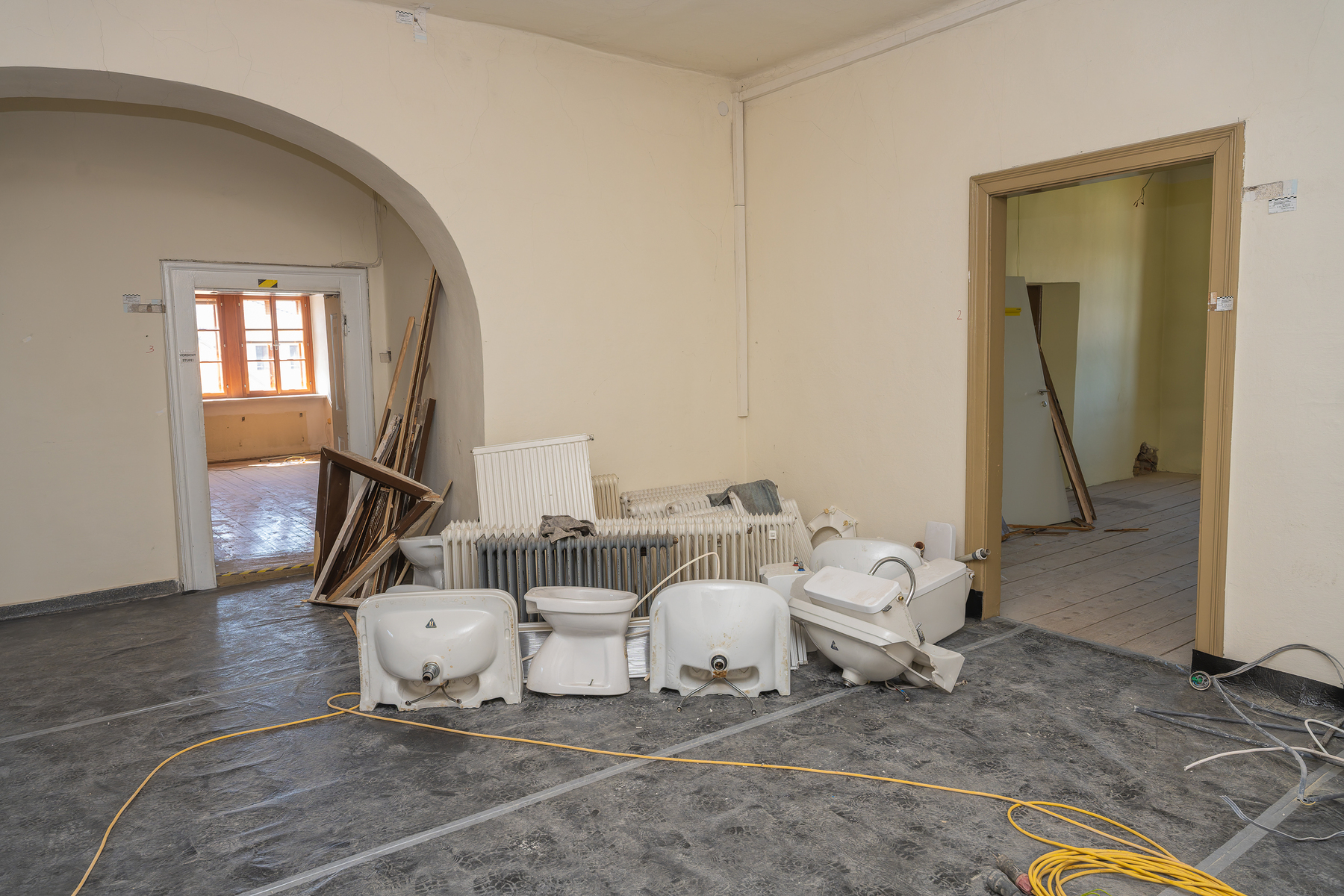 Dabei wurden zuerst die Mauern herausgeschlagen, um anschließend den Boden zu entfernen. Wie geplant, musste dieser aus statischen Gründen und damit auch die Decke des 1. Obergeschoßes unterhalb des Saals herausgerissen werden. Dafür wurde zuvor der denkmalgeschützte Ofen fachmännisch abgetragen.