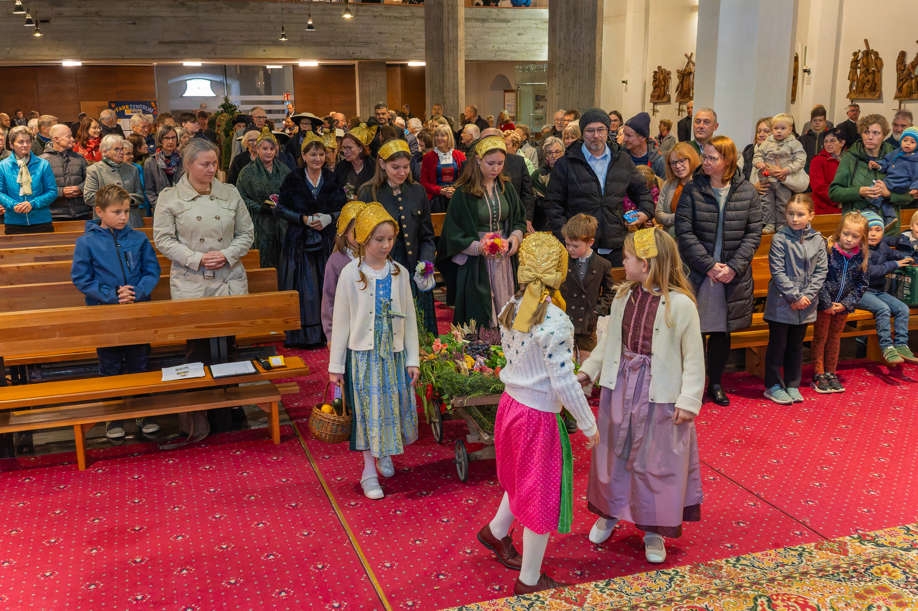 Kinder mit Goldhäubchen zogen ein Leiterwagerl mit Obst und Gemüse zum Altar, Frauen und Männer der Kirchdorfer Trachtengruppe in Festkleidung, dann die Erntekrone vor den MinisstrantInnen, Pastoralassistentin und Pfarrer. Der festliche Erntedank-Gottesdienst wurde musikalisch von der Musikkapelle Weinzierl-Altpernstein umrahmt.