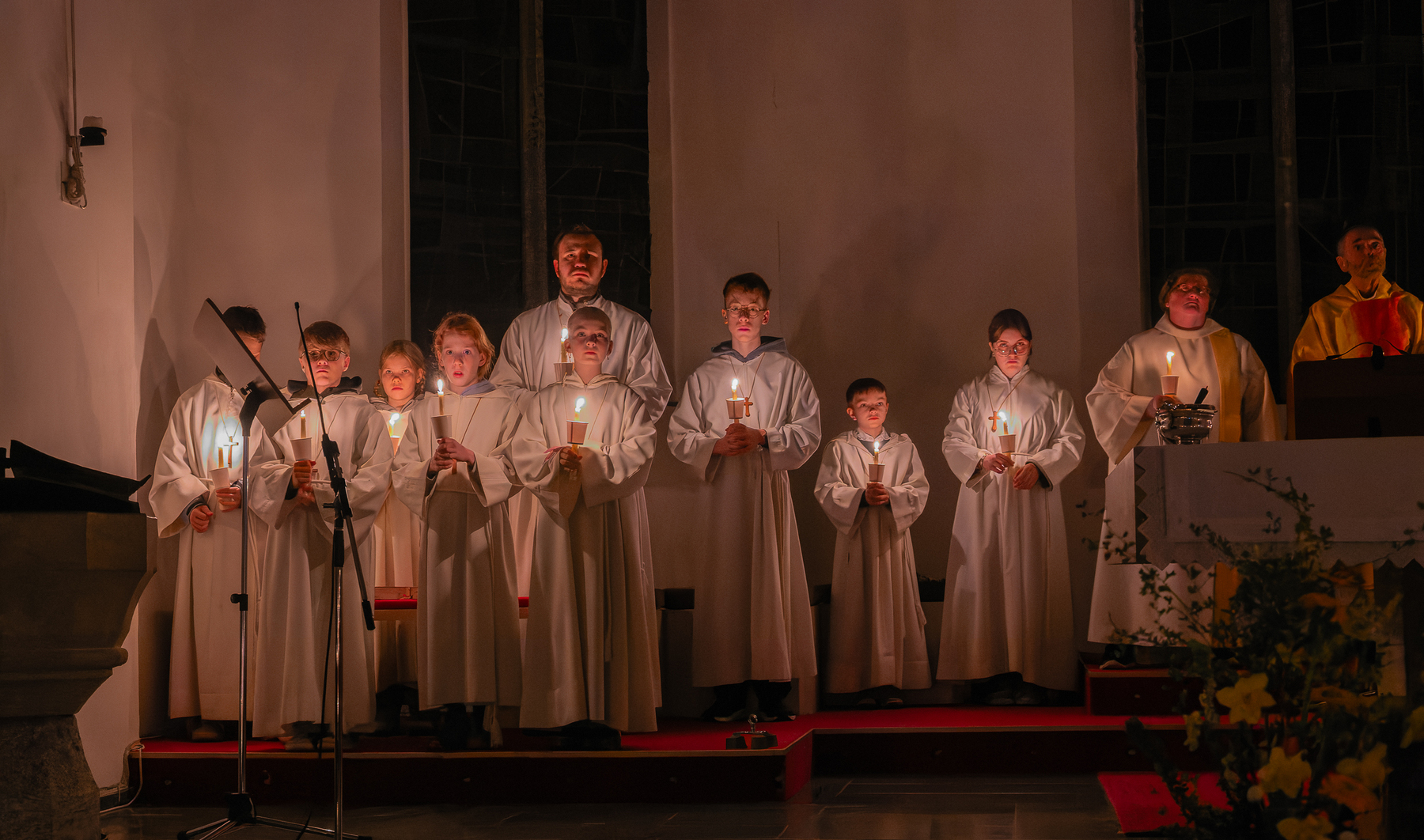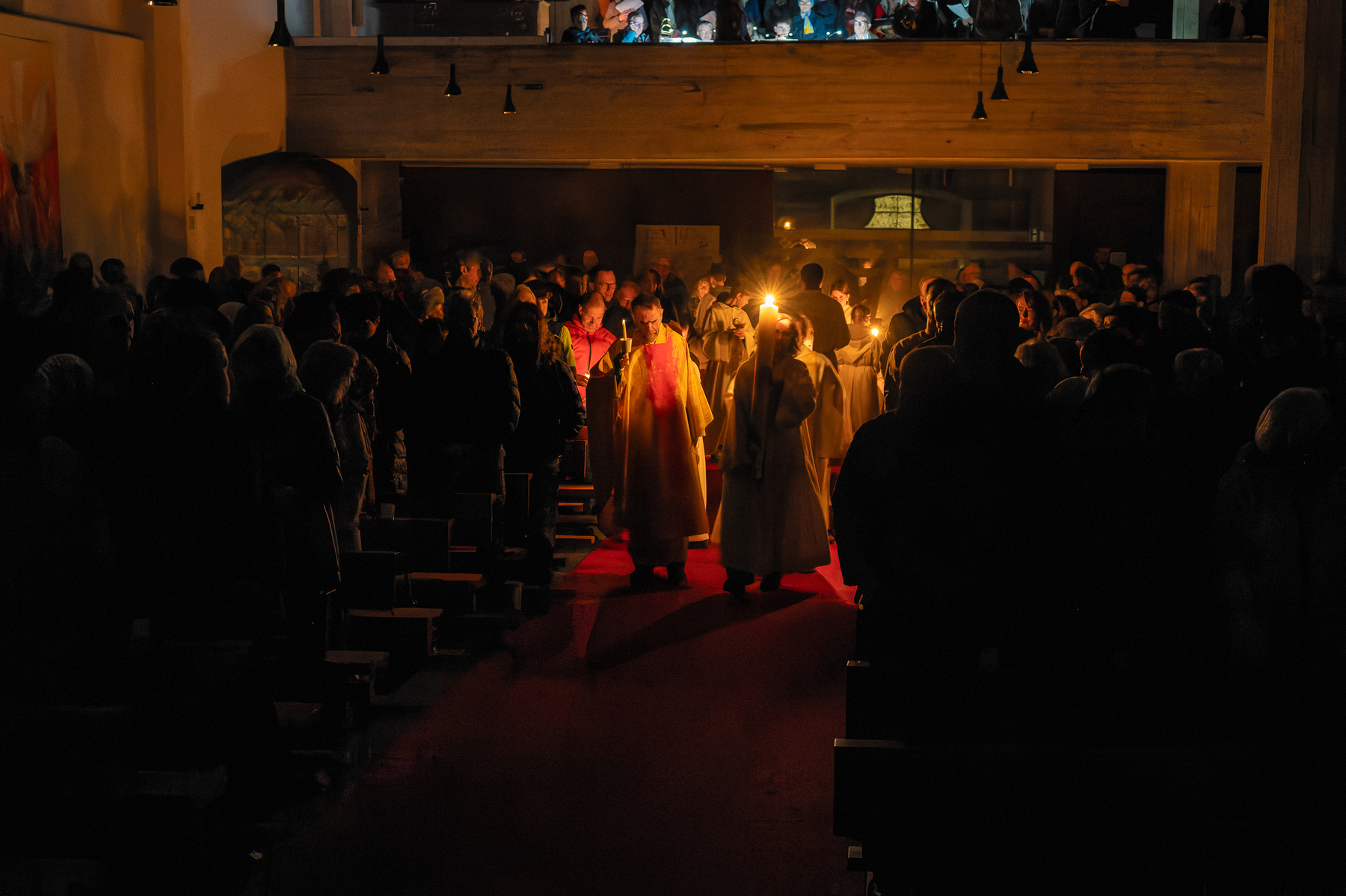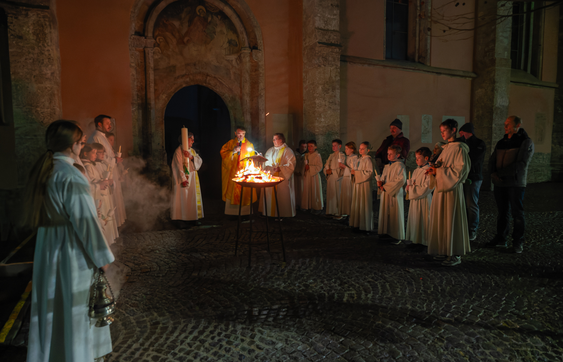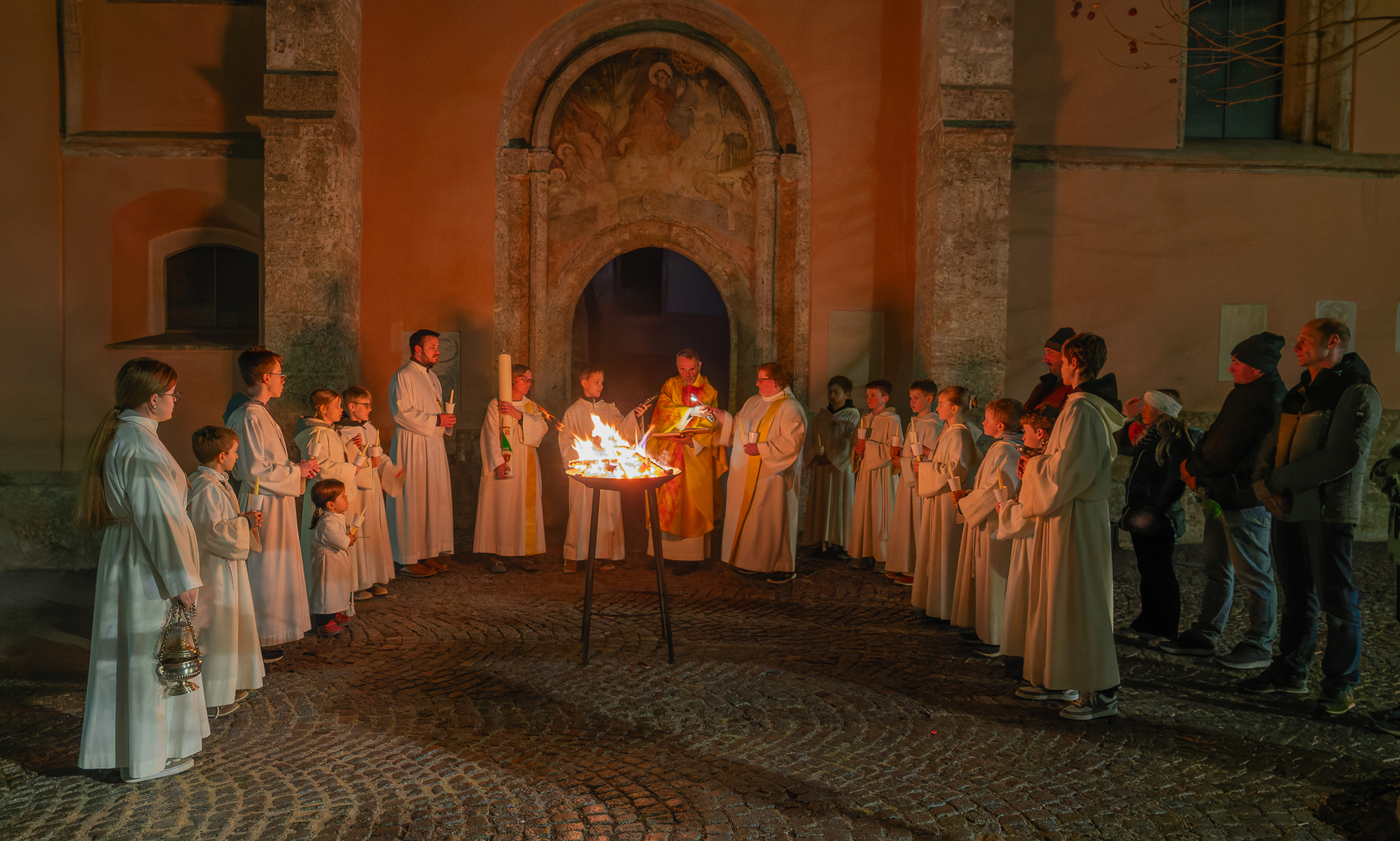 Diese besondere Nacht beginnt mit der Lichtfeier vor der Kirche beim Osterfeuer. An diesem wird die Osterkerze entzündet. Dieses Licht wird in die dunkle Kirche getragen und beim Ruf "Lumen Christi" weitergegeben. Dabei erhellt der Kirchenraum immer mehr.