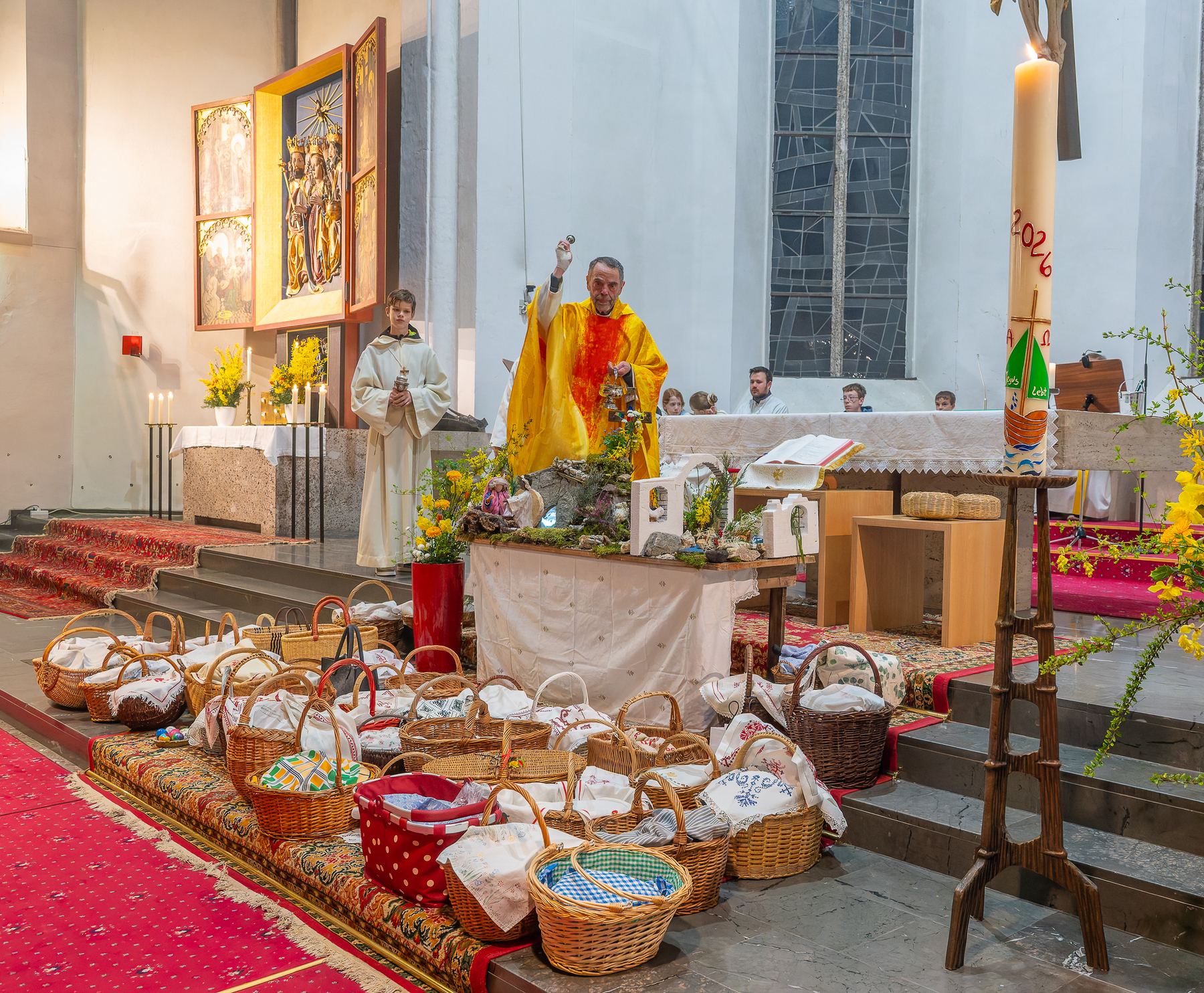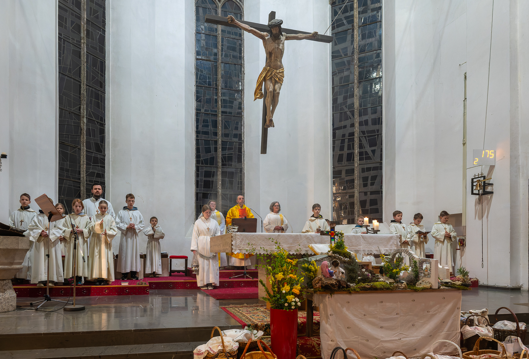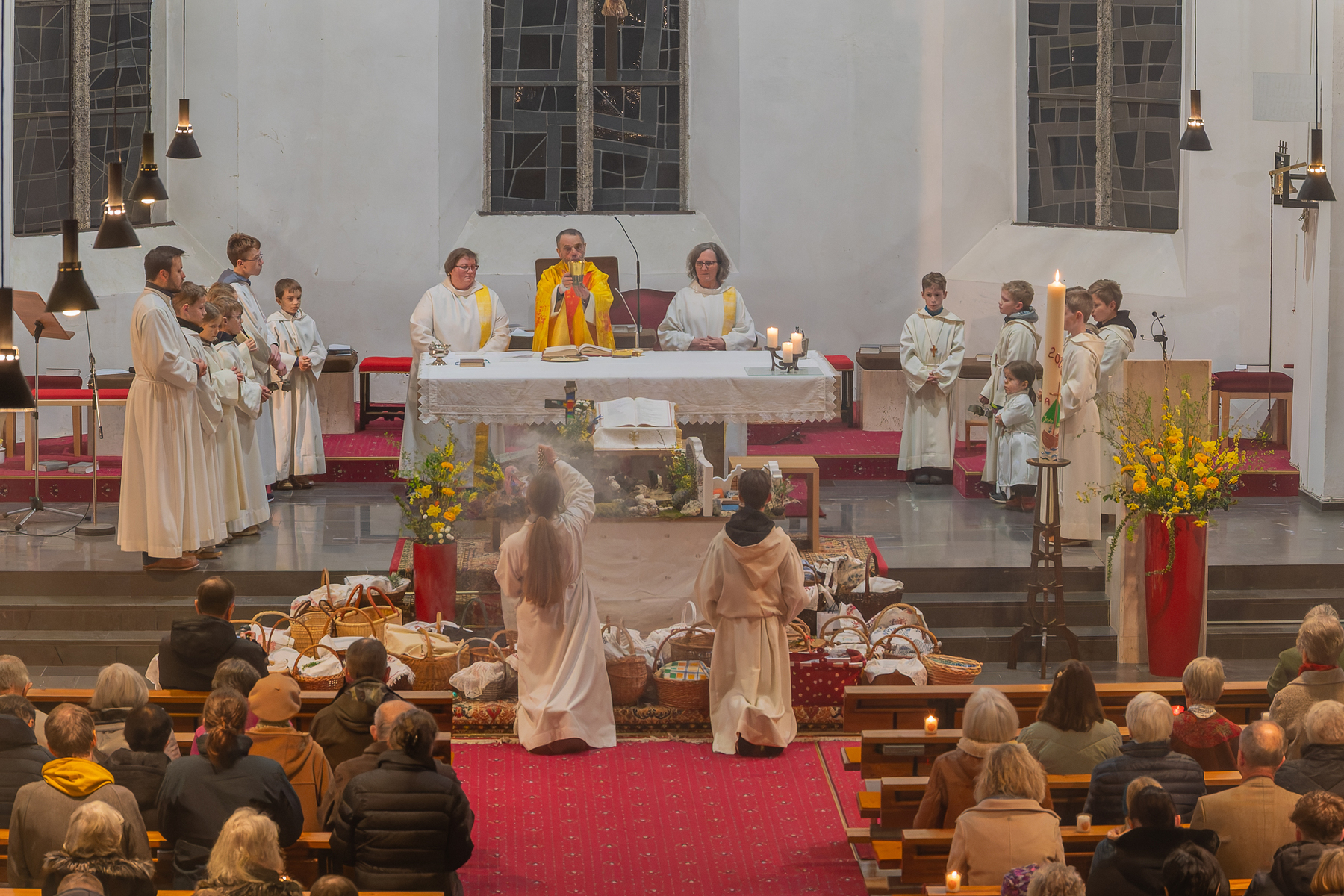 Nach der Wortgottesfeier, Tauferneuerung und Eucharistiefeier werden die mitgebrachten Speisen gesegnet und die Feier der Auferstehung mit dem Gesang "Großer Gott wir loben dich" abgeschlossen.