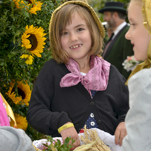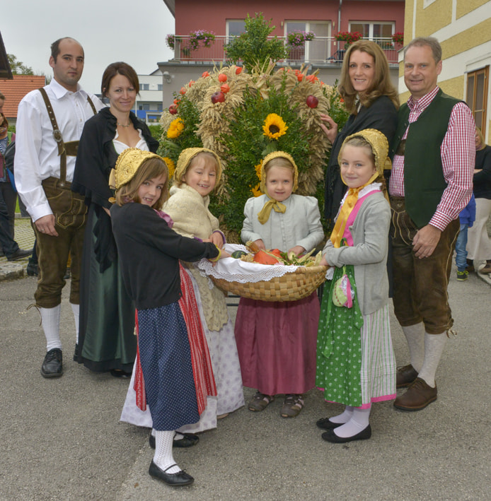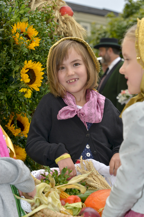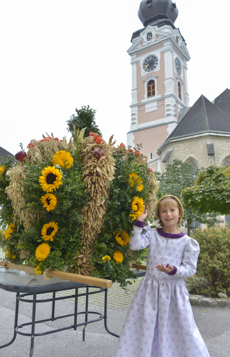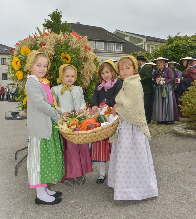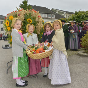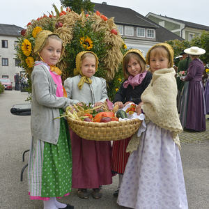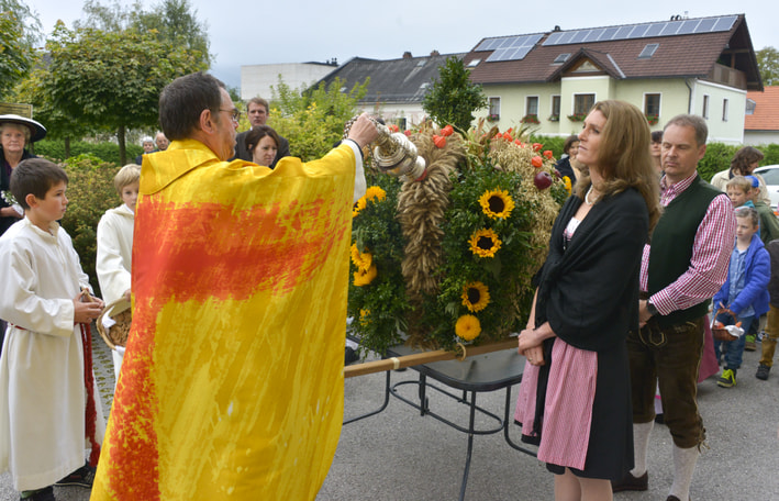 Vor dem Pfarrhof wurde die Erntekrone durch Pfarrer P. Severin gesegnet. In einer feierlichen Prozession mit der Trachtengruppe Kirchdorf, den Ministrantinnen und Ministranten, den Kindern mit bunten Körben und der Pfarrgemeinde wurde die Erntekrone in die Kirche getragen.