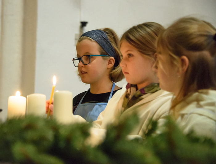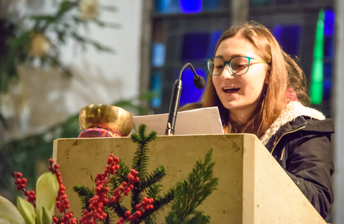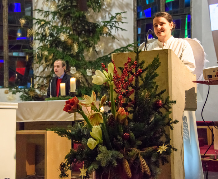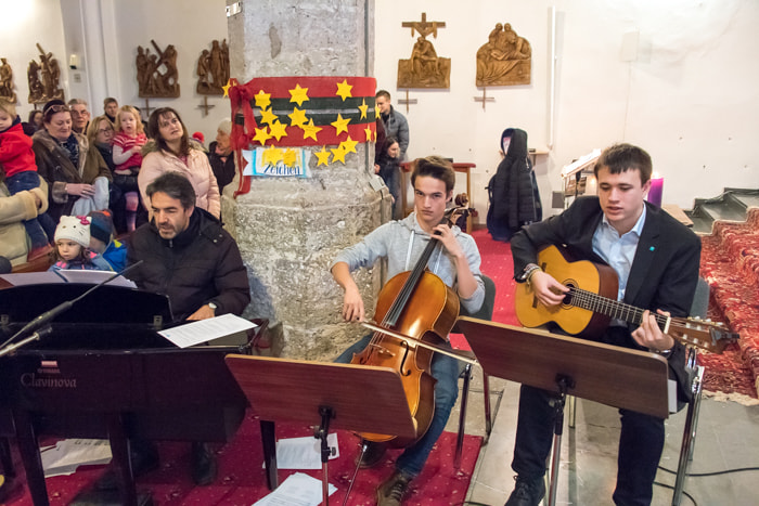 Schon vor dem Gottesdienst wurden Weihnachtsliedern zur Einstimmung gesungen, begleitet von Gregor Schrettle (Clavinova), Benedikt Schrettle (Cello) und Samuel Haijes (Gitarre).