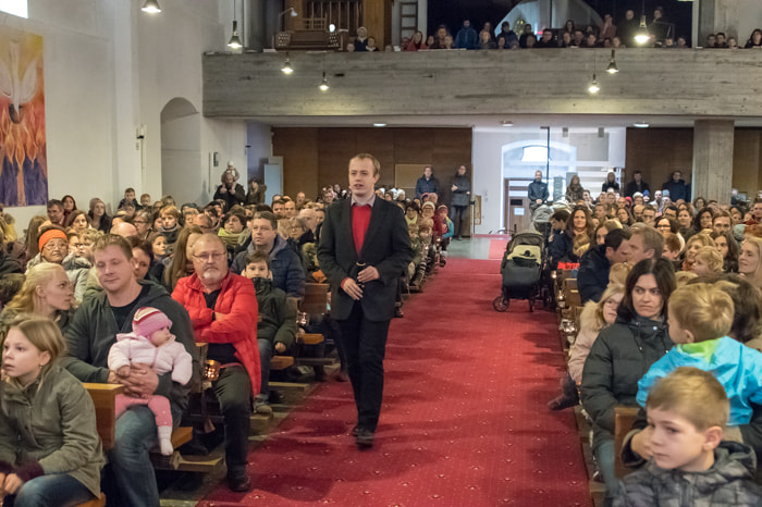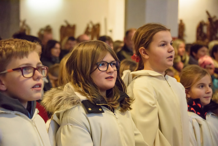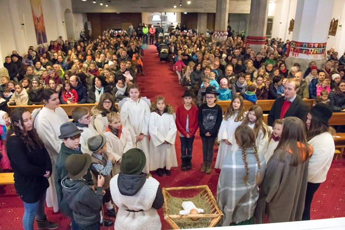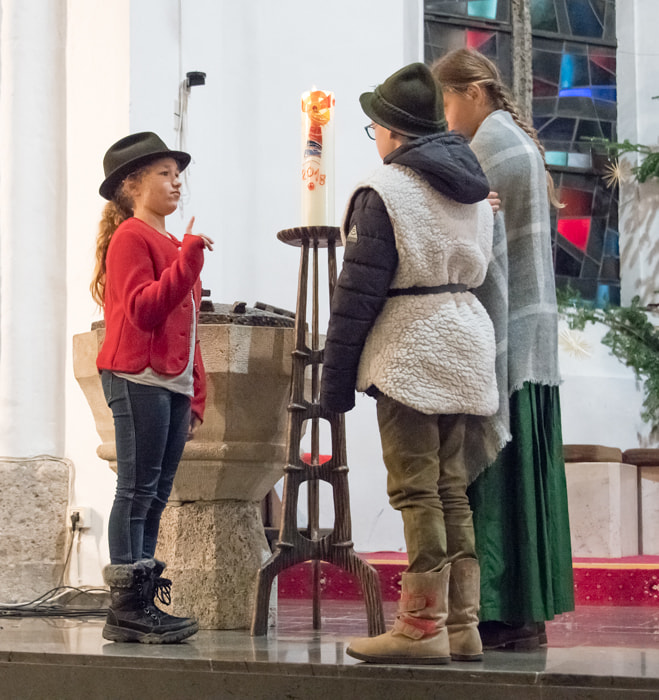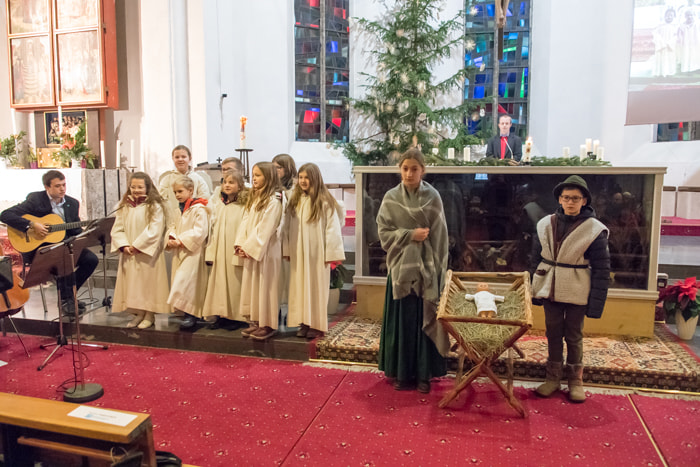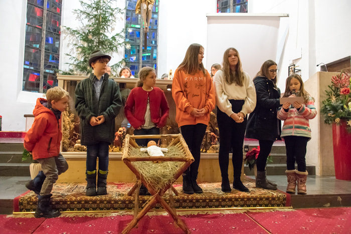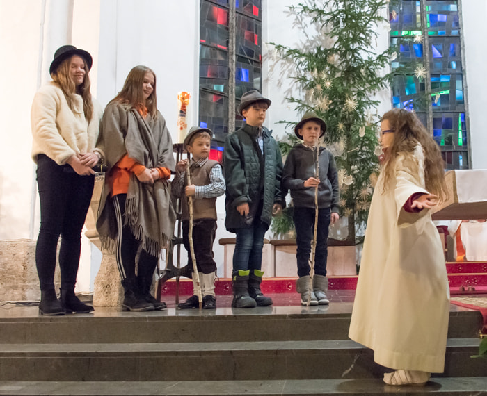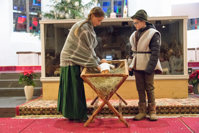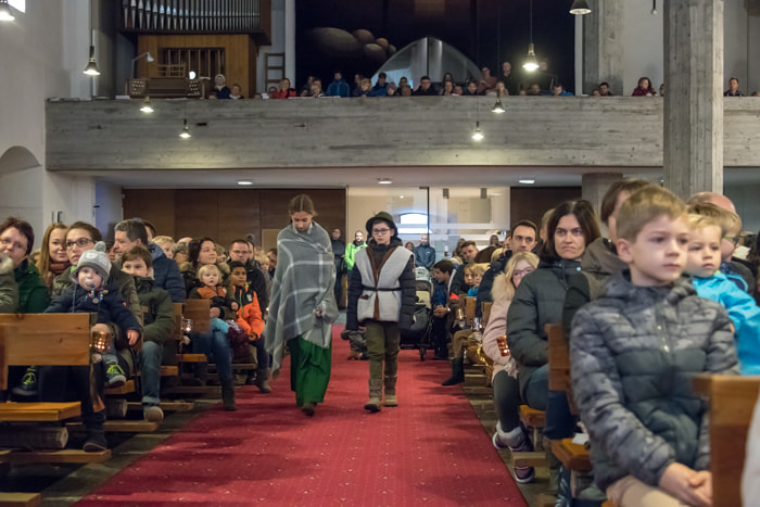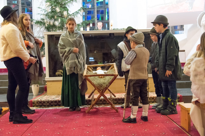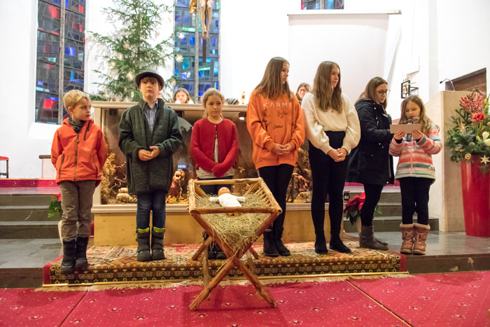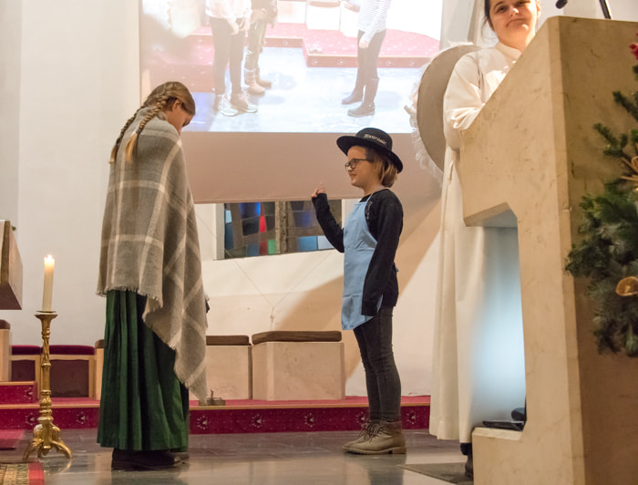 Pfarrer P. Severin Kranabitl freute sich, so viele Menschen begrüßen zu dürfen. Die Mädchen und Buben der Katholischen Jungschar stellten die Weihnachtsgeschichte szenisch dar. Erzengel Gabriel (Ida Winkler-Ebner) unterhielt sich mit Jakob Haijes und allen Gottesdienstbesuchern über die Geschehnisse in jener Zeit. Die Jungscharkinder stellten Maria und Josef, die Engelschar, Wirtsleute und Hirten dar. Zum Stille Nacht waren alle Mitwirkenden vor der Krippe versammelt.