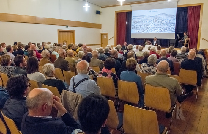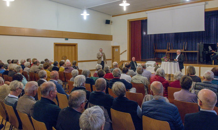 Viele folgten der Einladung und so war der Pfarrsaal am Mittwoch, 24. September voller interessierter Zuhörerinnen und Zuhörer. Anton Aschauer spannte seinen Bogen von den Anfängen der Pfarre über die verschiedenen (Neu-)Aufteilungen des Pfarrgebietes bis zu den Aus-, Zu- und Umbauten. Die Ausführungen wurden durch Peter Stögmüller mit Fotos aus seinem Fundus und dem Pfarrarchiv untermalt. Für Auflockerung sorgten Christoph Stöckler und Meinrad Möstl, die den Abend musikalisch auf Klavier und Gitarre umrahmten.