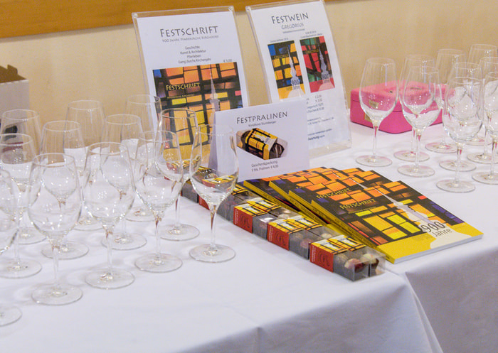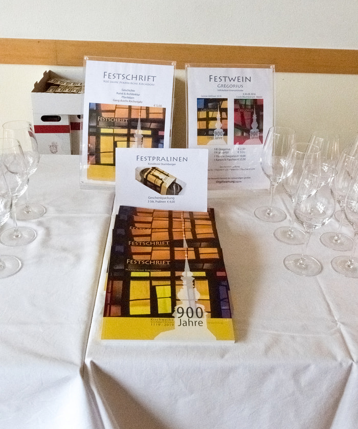 Zum Nachklingen schenkte das Team des Katholischen Bildungswerk den Jubiläumswein Gregorius aus und bot die Festschrift und die Festpralinen an. Diese gibt es ebenso beim großen Pfarrfest am Sonntag, 6. Oktober 2019 - herzliche Einladung zur großen gemeinsamen Feier!