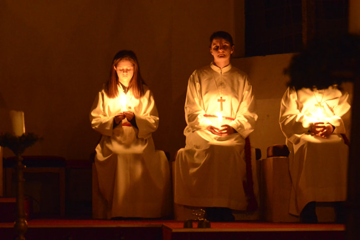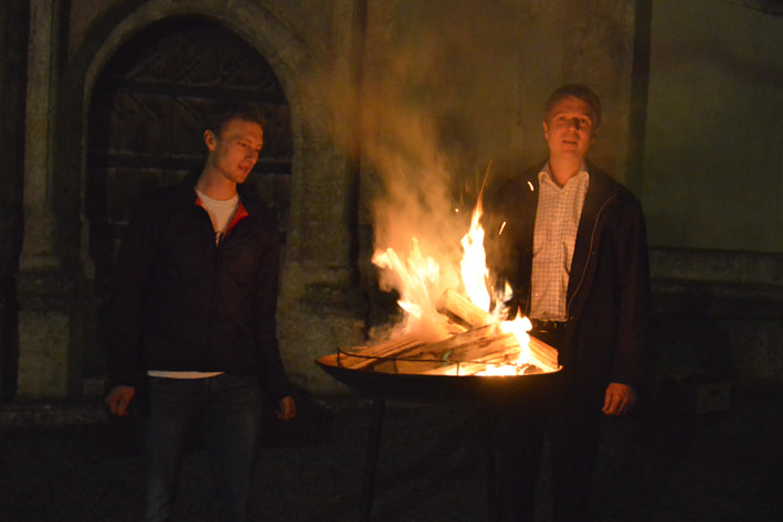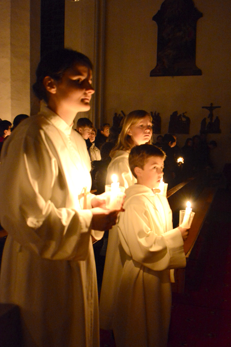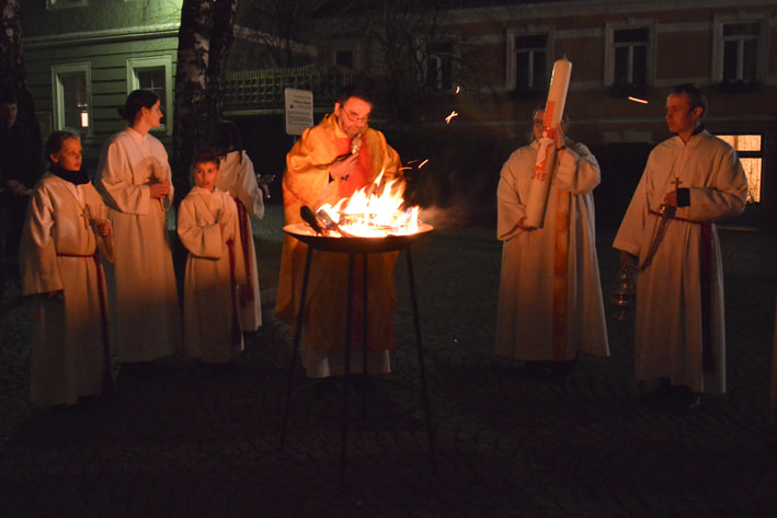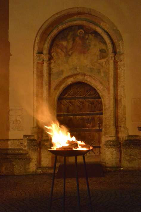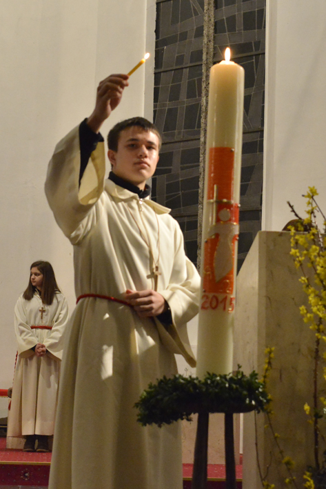 Vor der Kirche wurde das Osterfeuer entzündet. An diesem Feuer wurde die schöne Osterkerze von Pfarrer P. Severin Kranabitl und Pastoralassistentin Bernadette Hackl entzündet. Beim Einzug erhellte das Licht der Kerze den dunklen Kirchenraum. "Lumen Christi" -"Licht Christi", sang die Pastoralassistentin, die mit der Kerze voran in die Kirche zog. Die Ministrantinnen und Ministranten verteilten das Licht der Osterkerze in der Kirche.