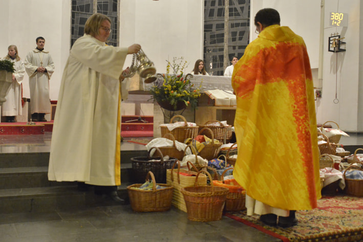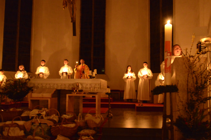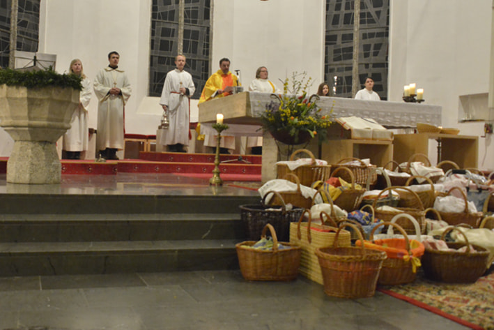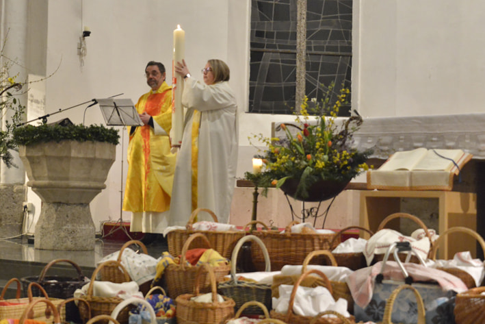 Nach der Segnung der mitgebrachten Speisen bedankte sich Pfarrer P. Severin Kranabitl für die Vorbereitungsarbeiten, den Sakristaninnen, Musikern, Ministranten und den Menschen, die gekommen waren, gemeinsam die Osternacht zu feiern. "Großer Gott, wir loben dich" war das feierliche Abschlusslied nach dem Segen.