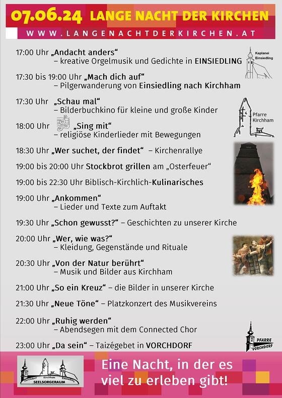 Um 17:00 Uhr starteten wir in diesen besonderen Abend mit einer „Andacht anders“ in der Kirche Einsiedling. Organist Elias spielet ABBA, Beatles, Reinhard Mey und andere Interpreten und P. Franz ergänzte mit Gedichten von Andreas Knapp. Ca. 20 Personen machten sich dann im Anschluss daran gemeinsam mit Manuela und Annemarie von der KFB zu Fuß auf den 5,5 km langen Weg nach Kirchham. Dort hatte mittlerweile schon das Kinderprogramm mit „Bilderbuch-Kino“, „Kirchenrallye“ und „Bewegungsliedern“ gestartet. Als Stärkung konnten die Kids dann ihr Stockbrot am „Osterfeuer“ grillen. Ab 19:00 Uhr begeisterte die Sängerrunde Laudachtal und Karl Baumgartner mit traditionellen Liedern und sinnigen Geschichten. Im Anschluss erzählte Helmut Piringer Geschichten aus der Kirchhamer Kirchengeschichte. Um 20:00 Uhr war einer der Höhepunkte. Unter dem Titel „Wer, wie, was?“ präsentierten unsere Minis, was man(n) in der Kirche so trägt … von der Albe bis zum Zingulum, vom Messkleid bis zur Mitra. So verwandelte sich der Altarraum in einen Catwalk und die Besucher*innen waren ganz angetan von unseren Mini-Models.