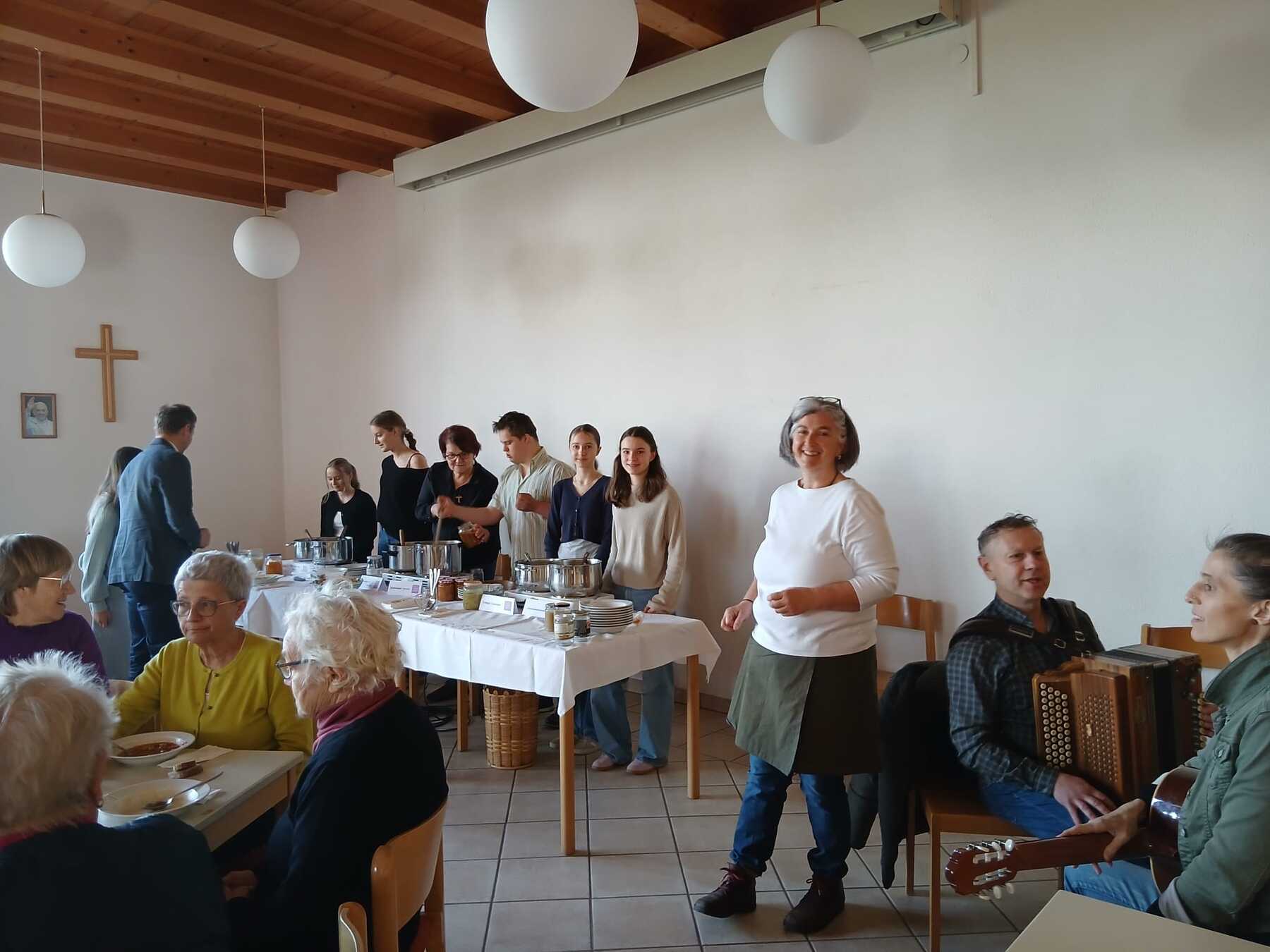 Im Anschluss an den Gottesdienst folgten zahlreiche BesucherInnen der Einladung der kfb zum traditionellen Suppenessen, frischen Bauernkrapfen und Kaffee. In gemütlicher Atmosphäre bot sich mit Unterstützung von Firmlingen und Musikern die Gelegenheit zur Begegnung und zum Austausch, während gleichzeitig ein Beitrag für den guten Zweck geleistet wurde.