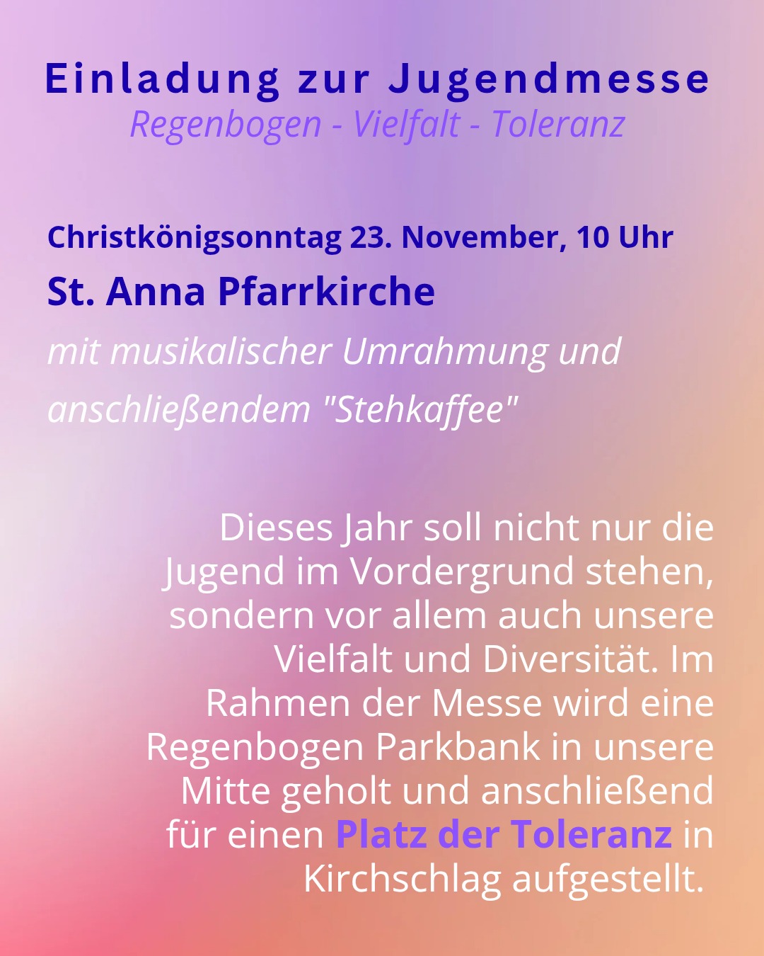 Im Gottesdienstes wird die von Jugendlichen gestaltete Regenbogenparkbank in die Mitte der St. Anna Kirche geholt. Sie soll in Kirchschlag aufgestellt werden und zu einer Haltung der Toleranz einladen.