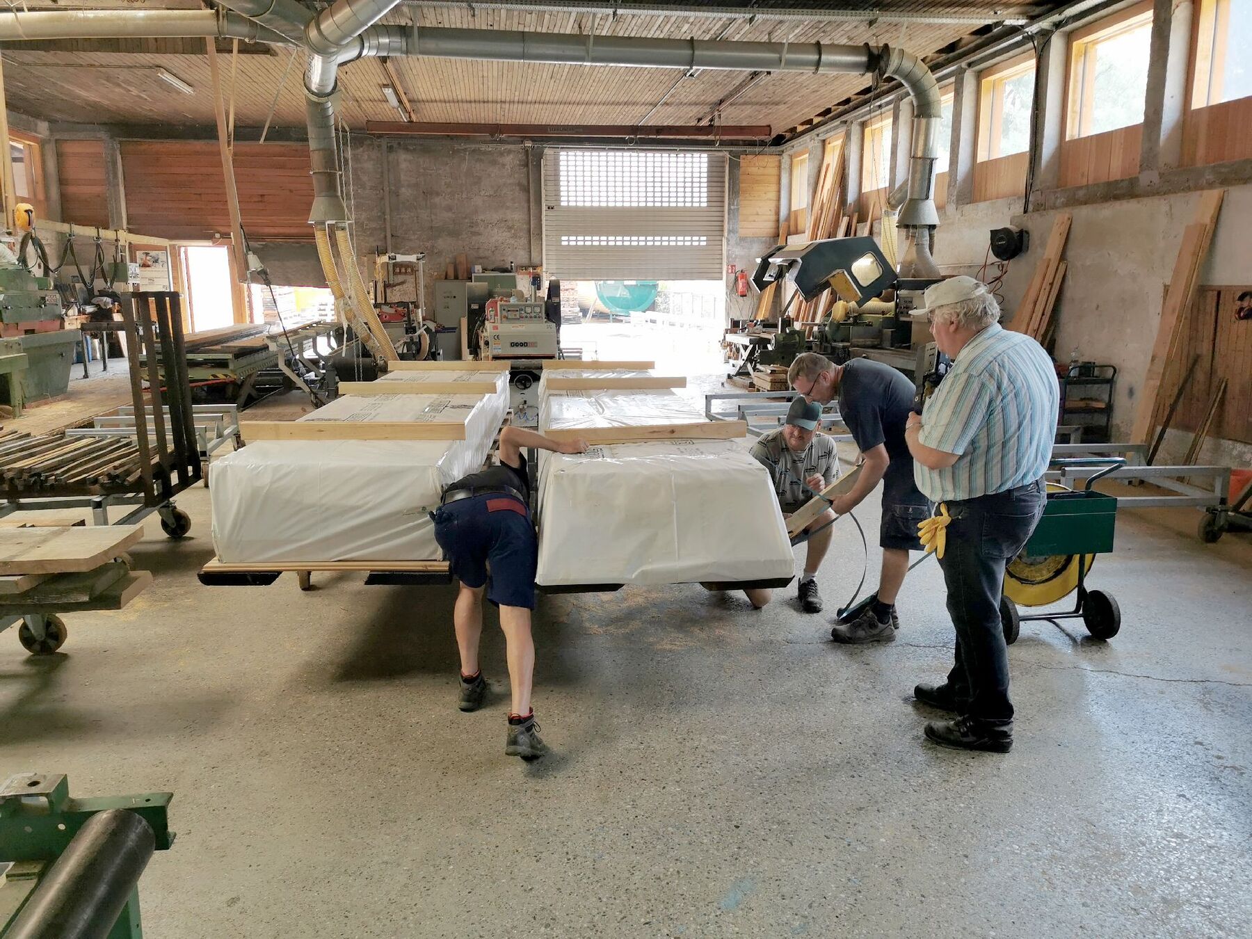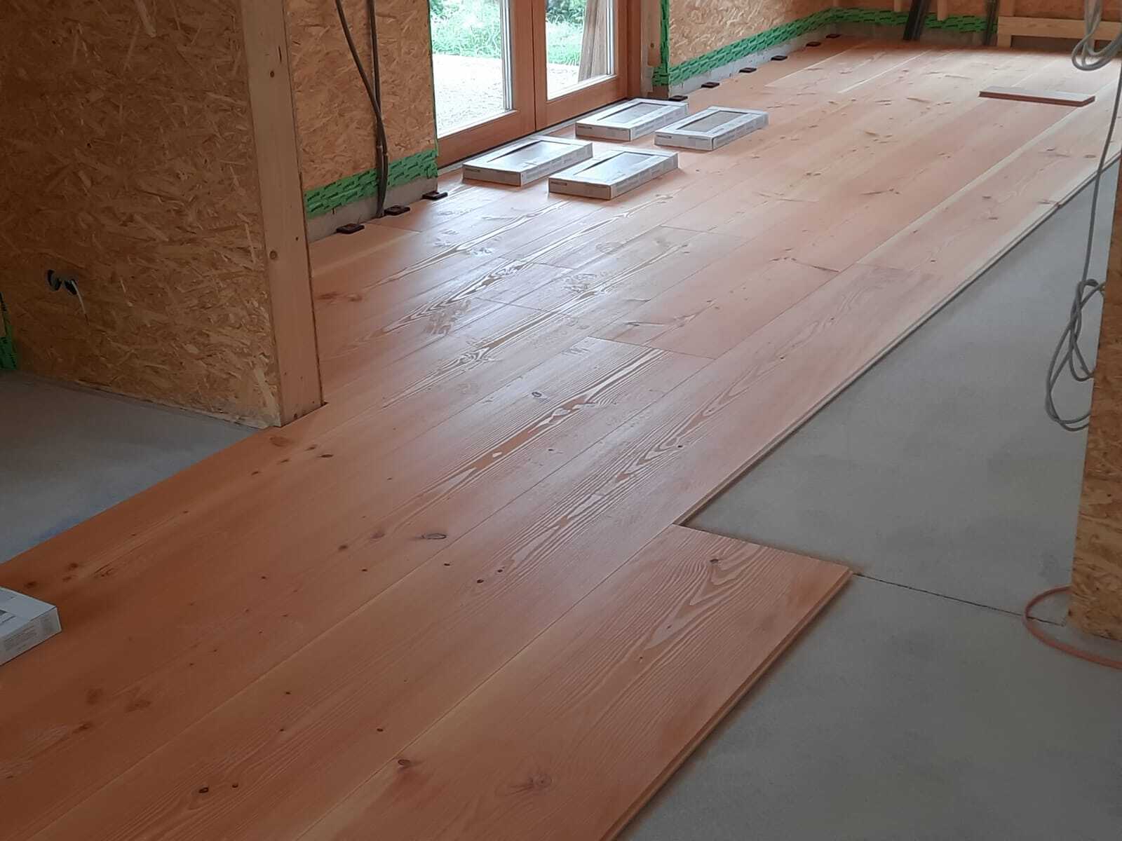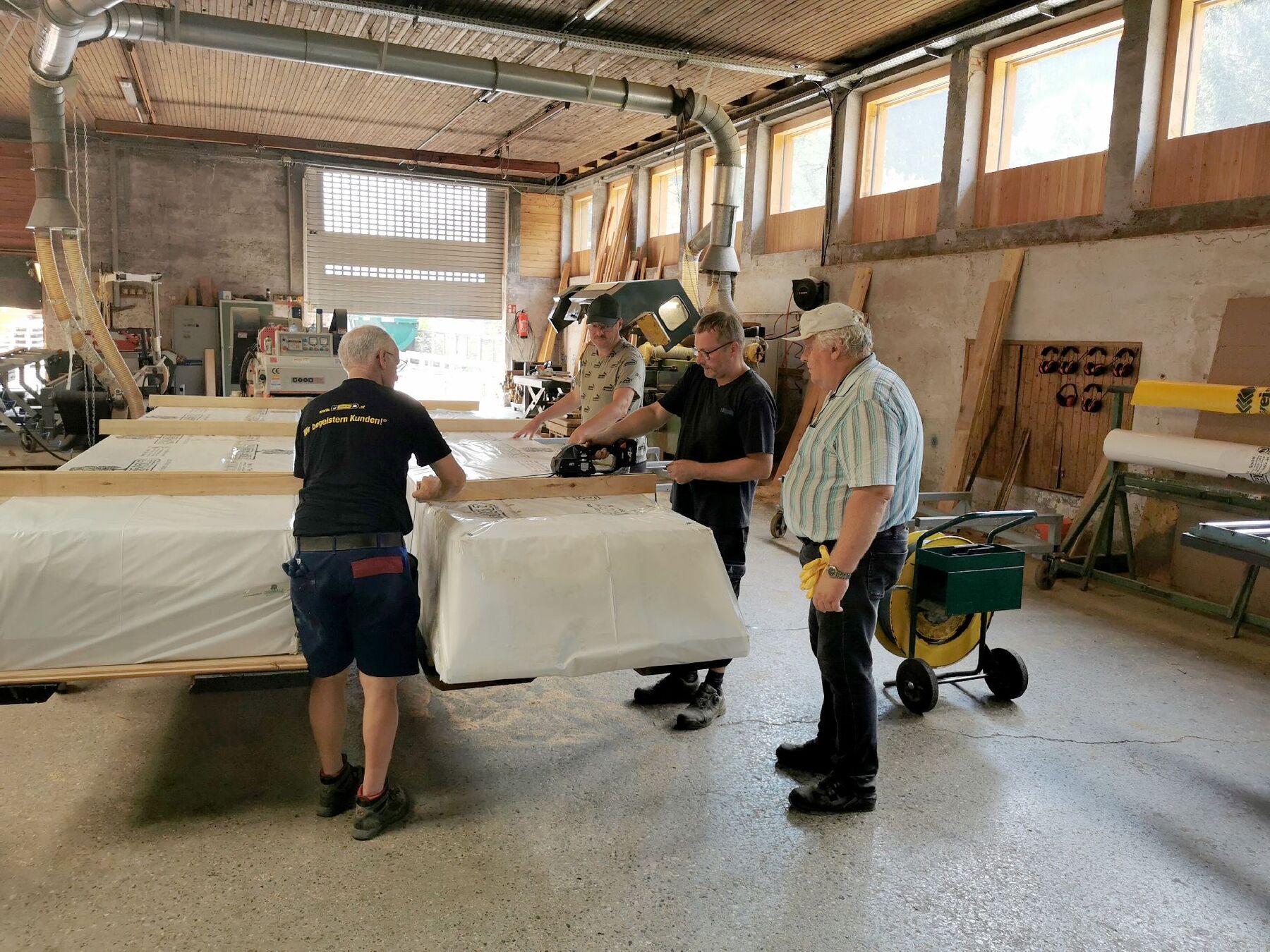 Die Firma Hanger hat den Fußboden im neuen Pfarrheim gespendet. Das Douglasien-Holz stammt vom Damberg. Die Fertigung ist im Sägewerk unter fachkundiger Anleitung von der Firma Hanger durchgeführt worden, freiwillige Helfer von der Pfarrgemeinde haben mitgeholfen.