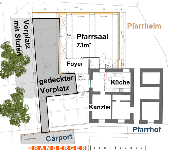 Im Außenbereich erweitert sich das neue Pfarrheim um den gedeckten Vorplatz - einer überdachten Terrasse, die in Sitzstufen ausläuft. Der ideale Platz für Feiern in der warmen Jahreszeit, wie die Mostkost, das Kirchweihfest und Erntedank oder die Sommernachtslesung. Innen und Außen lassen sich verbinden.