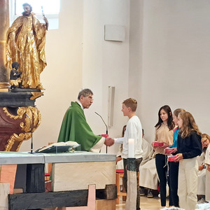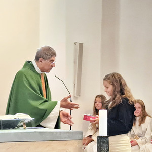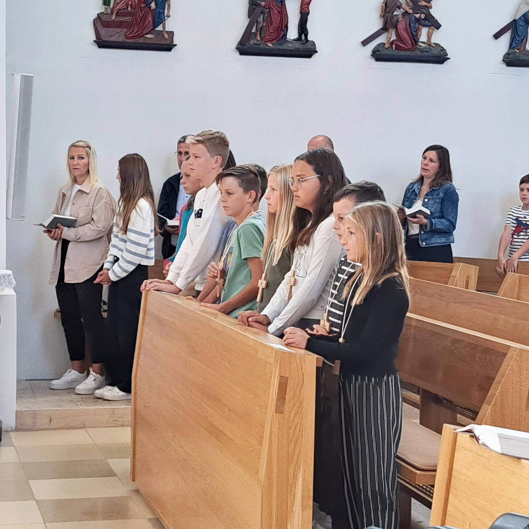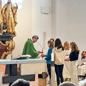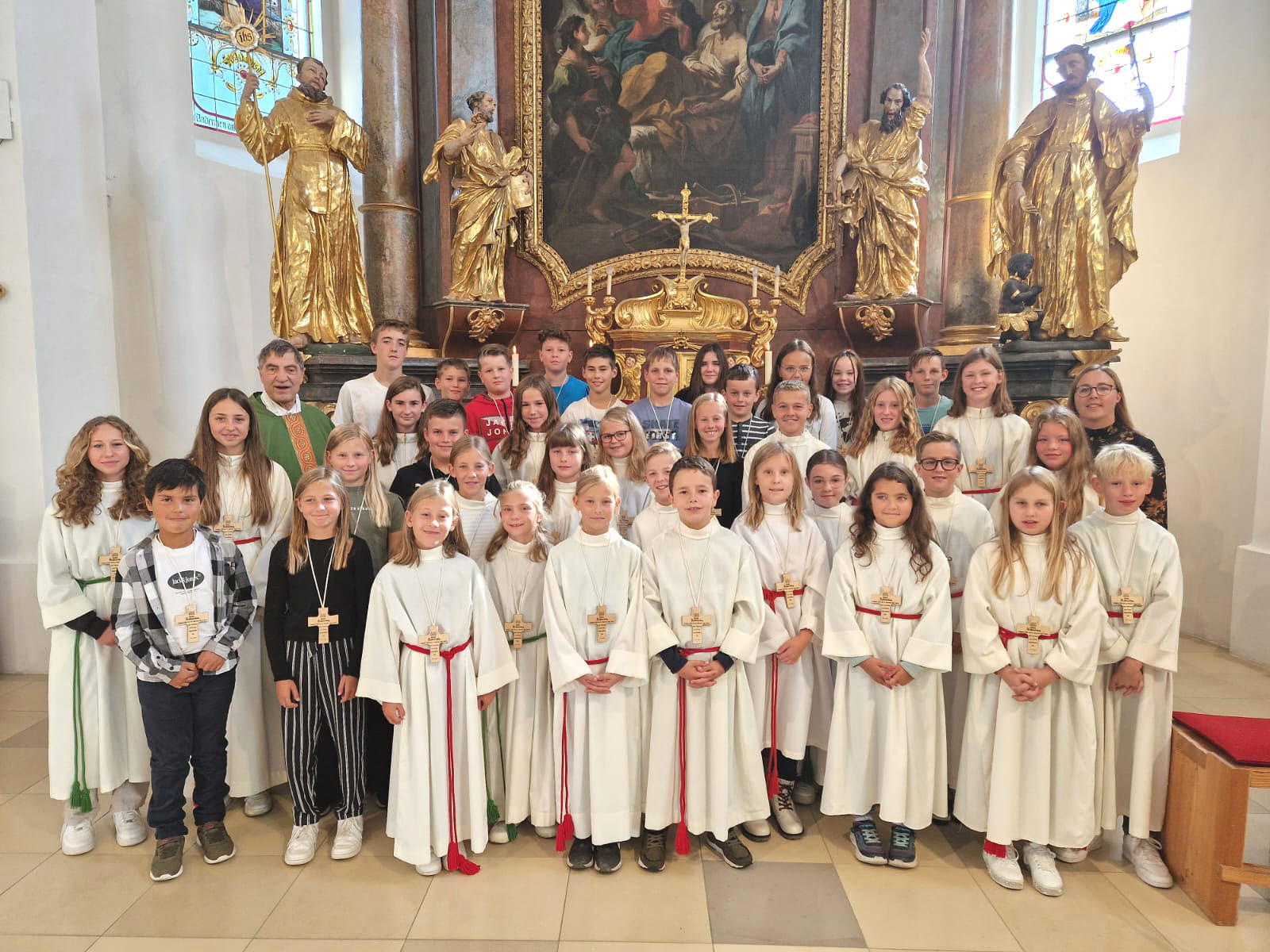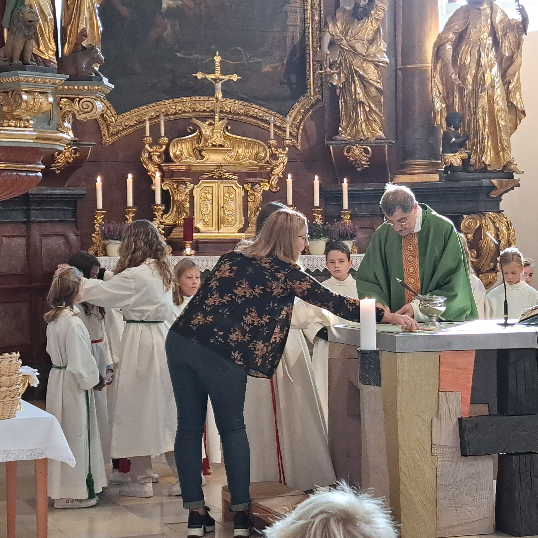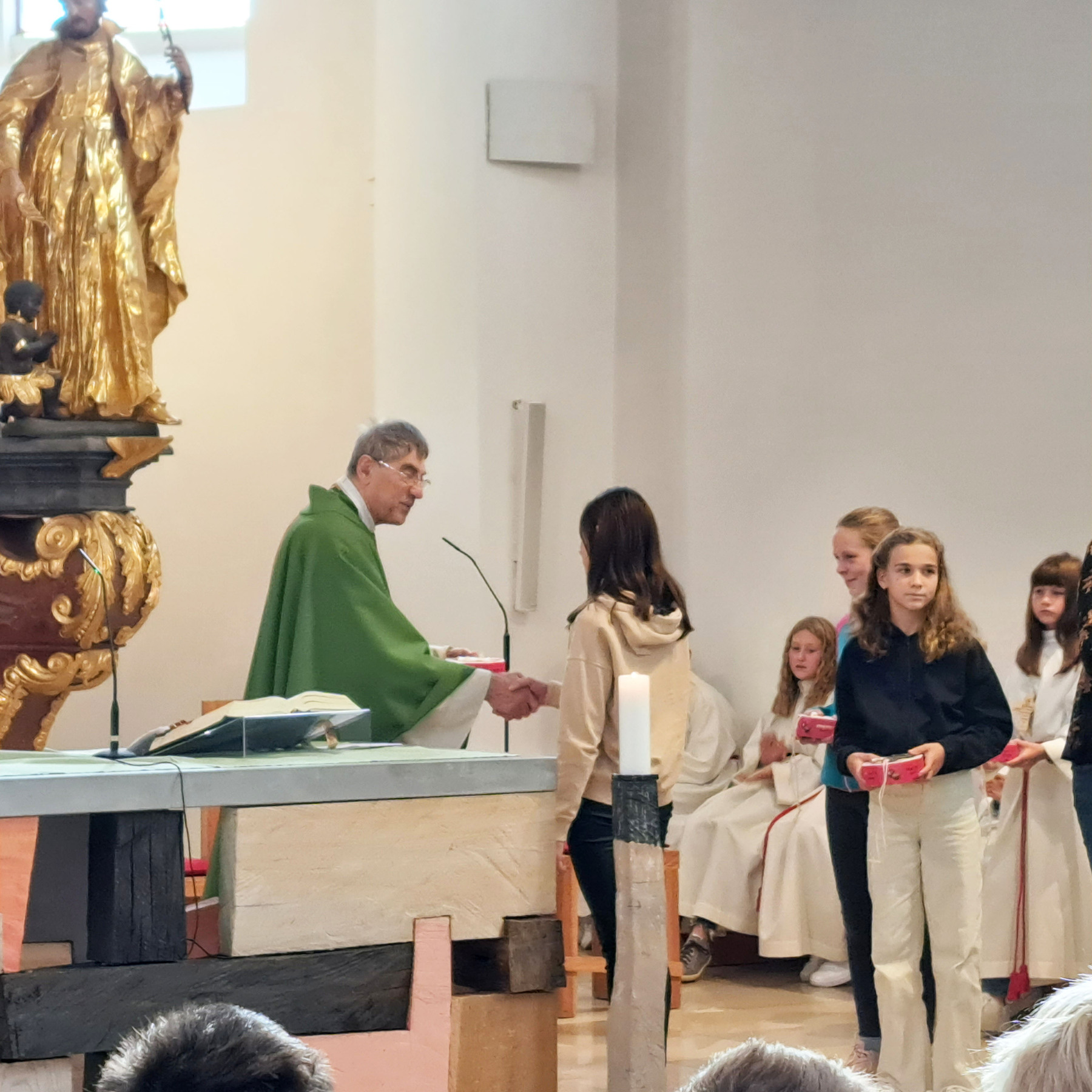 Dankbar mussten wir auch Abschied nehmen. Sina Dumps beendet ihren Dienst nach zwei Jahren, Vanessa und Madeleine Reischl nach drei Jahren und Simon Hutter nach vier Jahren. Vielen Dank für euren jahrelangen Einsatz für unsere Pfarrgemeinde. Als Dank und Anerkennung haben sie von der Pfarre ein Glaskreuz und etwas Süsses erhalten.