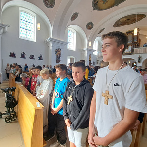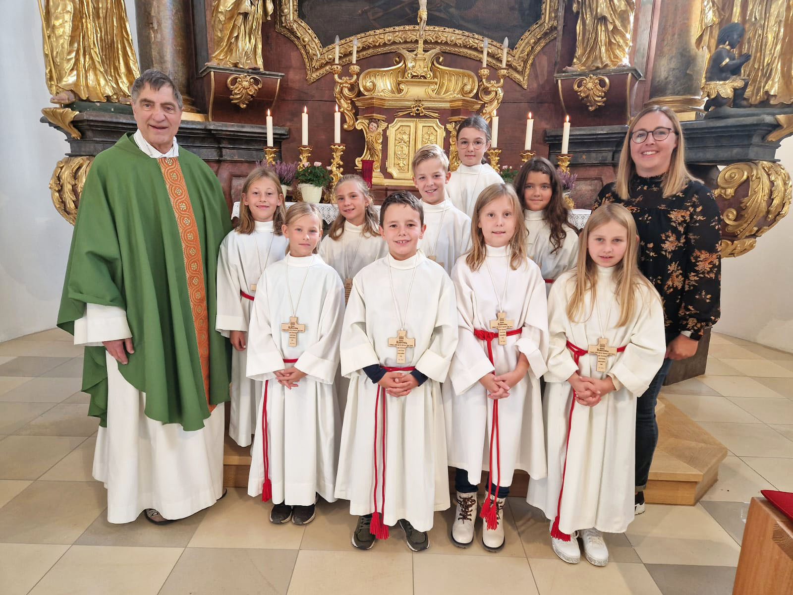 Pfarrer Laurenz überreichte allen neuen Ministrantinnen und Ministranten ein Holzkreuz für ihren Dienst in der Pfarre. Auch alle anderen Ministranten, die schon länger ihren Dienst in der Kirche ausüben, bekamen ein Holzkreuz, dass beim Ministrantendienst immer getragen wird.