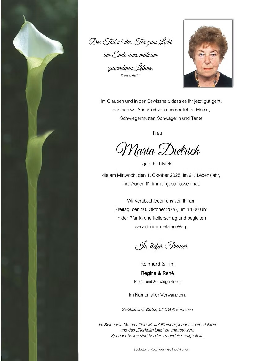 Wir trauern um Frau Maria Dietrich (geb. Richtsfeld), zuletzt wohnhaft in Gallneukirchen, verstorben im 91. Lebensjahr.