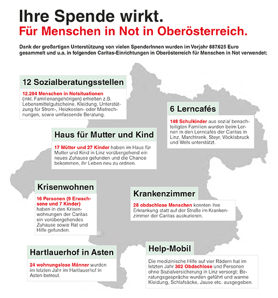 Mit diesen Geldern konnte in den 12 Sozialberatungsstellen 12.204 Menschen Hilfe geboten werden, fanden 17 Mütter und 27 Kinder vorübergehend ein Zuhause im Haus für Mutter und Kind, konnten 9 Erwachsene und 7 Kinder ein vorübergehendes Krisenwohnen in Anspruch nehmen, wurden 24 wohnungslose Männer im Hartlauerhof in Asten betreut, wurden 302 Obdachlose medizinisch mit dem Helpmobil versorgt, konnten 28 Obdachlose ihre Erkrankung im Caritaskrankenzimmer auskurieren und wurden 148 Schulkinder sozial benachteiligter Familien in Lerncafes unterstützt. Das Tageszentrum Wärmestube in Linz ist Treffpunkt für Menschen in Wohnungsnot.