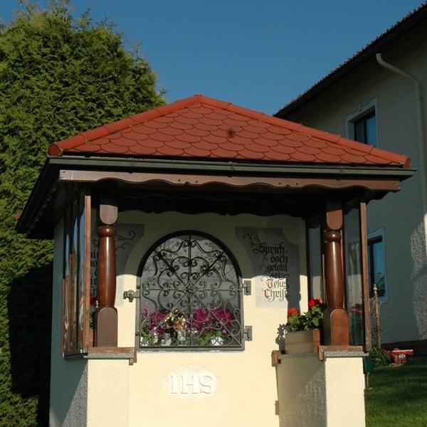 Das Stöckl (Höhe ca. 2,8 m, Vorderseite 2,75 m Tiefe 3 m) ist eine kleine Kapelle mit einem spitzen Eternitdach, die einen 1,4 m breiten beiderseits gemauerten, beim Eingang offenen, der auf der Eingangsseite von zwei gedrechselten Säulen (Höhe 1,2 m Holzstärke 140 mm x 140 mm) abgestützt wird. Die Nische ist 1,5 m zurückgesetzt und ist mit einer, oben runden, schmiedeeisernen Tür (Höhe 1 m, Breite 0,92 m) verschlossen. Unter der schmiedeeisernen Tür ist das JHS Zeichen aufgeputzt. In der Nische steht die Statue des Auferstanden Heilands, davor befindet sich im Monat Mai eine Madonna mit Kind. An den schräg zu einander stehenden Außenwänden ist je ein Engel angebracht. Links und rechts neben der schmiedeeisernen Tür stehen die oben angeführten Sprüche. Der Boden dieser kleinen Kapelle ist mit Granitplatten ausgelegt. An den seitlichen Außenwänden ist je ein Kreuz (Höhe 560 mm, Breite 370 mm) in den Putz eingearbeitet. Der Zugang und neben den Außenwänden rund um die Kapelle ist eine Betonplattenpflasterung.