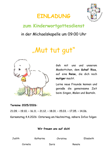 Was ist Mut? Was erfordert Mut? Gibt es mutige Menschen in der Bibel? Lasst uns gemeinsam auf Entdeckungsreise gehen. Jeden 3. Sonntag im Monat um 9 Uhr in der Michaelskapelle. Die einzelnen Termine sind am Flyer vermerkt.