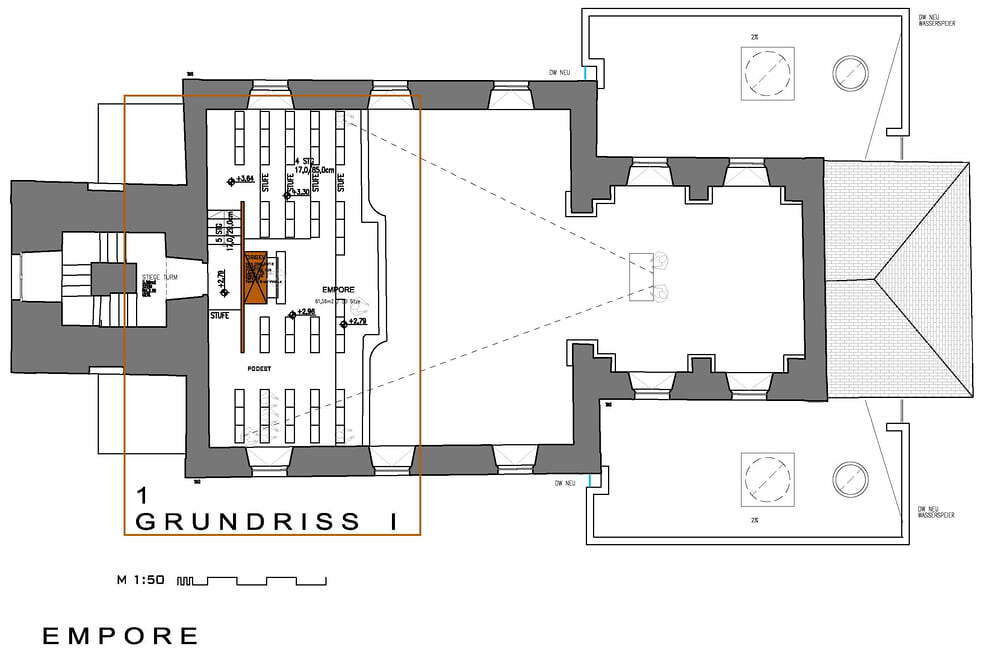 - Symetrische Zubaulösung mit gleichtiefen Seitentrakten südlich und nördlich des Presbyteriums für Kirchensitze, Taufbereich, Sakristeierweiterung und Manipulationsraum mit rückwärtigen Eingängen.