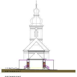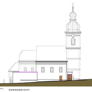 - Windfänge im Turmbereich und Erweiterungsbauten im Bereich Presbyterium und Sakristei bis auf bestehende Gesimshöhe des östlichen Zubaues.