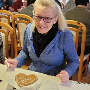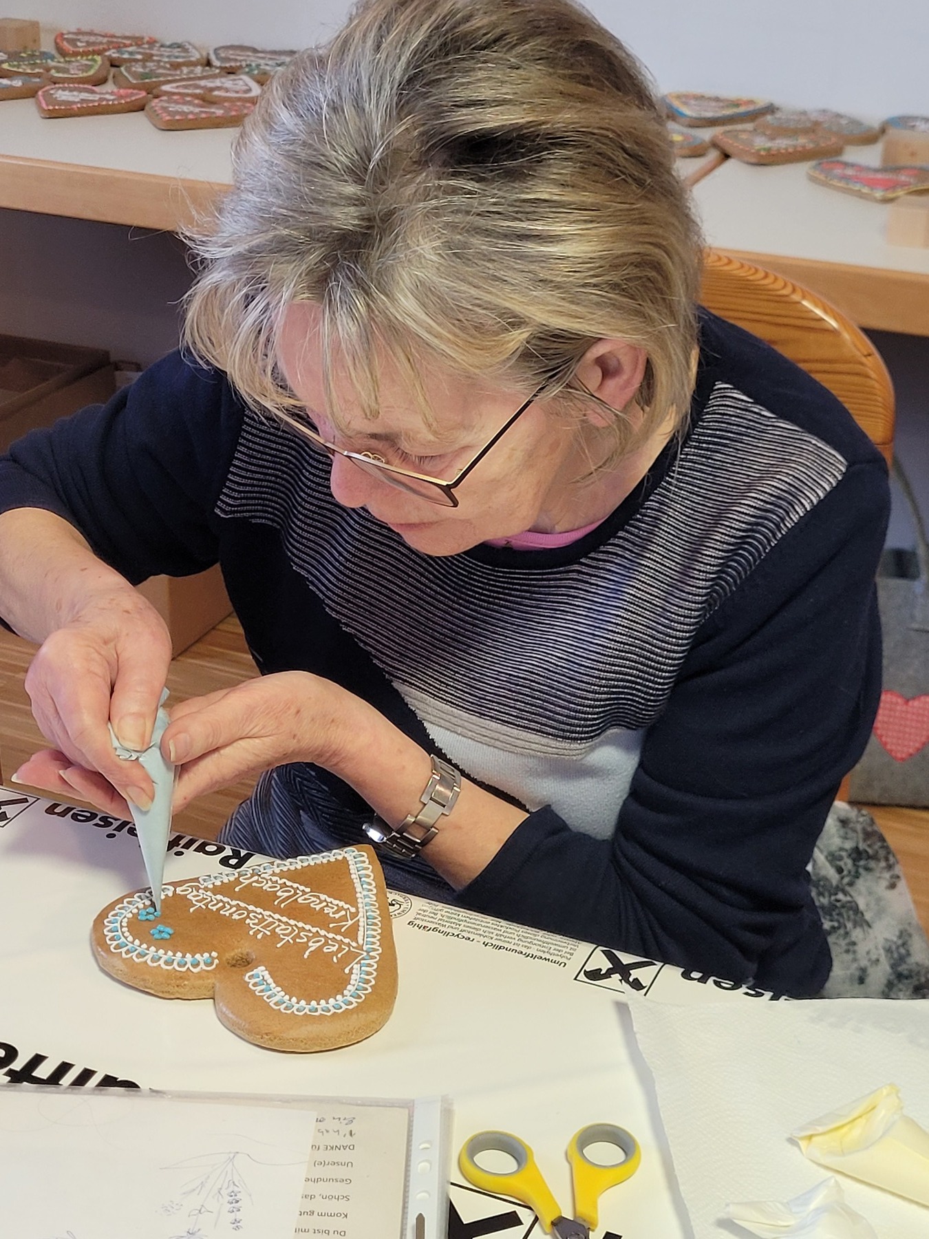 Gemeinsam werden die Liebstattherzen mit Sprüchen und Muster verziert.