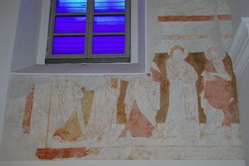 1999 wurden die vier Fenster des Altarraumes sowie die vier Fenster an den Längsseiten von Inge Dick neu gestaltet. Dieser Einbau der "blauen Fenster" bedeutete eine starke Veränderung des gesamten Kirchenraumes, der nun manchmal wunderbar mystisch, manchmal aber auch kalt wirkt. Die Kunstwissenschaftlerin Prof. DDr. Monika Leisch-Kiesl sagte bei der feierliche Einweihung : "Der Raum vermittelt nun eine große, aber nicht leere Stille. Ich hätte diesem Blau nicht so viel Wärme zugetraut. Dieses Blau - von der Farbpsychologie her ist Blau die Farbe der Ferne, in der abendländischen Bildtradition auch die Farbe der Transzendenz - verzaubert und verwandelt den ganzen Raum, ohne ihn in seiner Materialität auszulöschen. Und diese Spannung finde ich aufregend. Der Raum bleibt materiell und bekommt trotzdem eine neue geistige Qualität. Die Außenwelt schimmert noch durch, die Fresken erscheinen in einem neuen Schimmer, selbst das Kreuz und der Altar, ein schwerer Stein, bekommt eine gewisse immaterielle Qualität. "