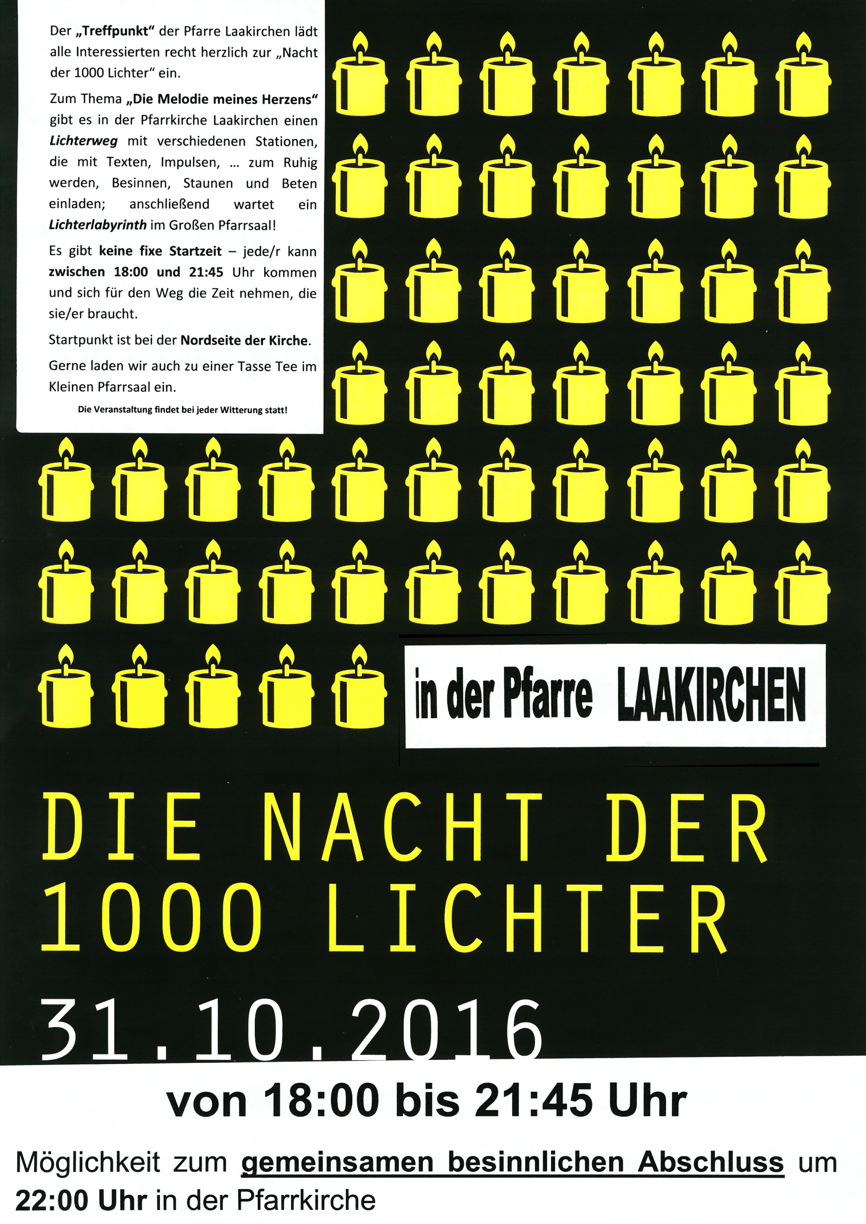 Unter dem Thema „Die Melodie meines Herzens“ wird es in der Pfarrkirche einen Lichterweg mit verschiedenen Stationen geben, die mit Texten, Impulsen, Gedanken… gestaltet sind; anschließend führt ein Weg zu einem Lichterlabyrinth im Großen Pfarrsaal. Zu einer Tasse Tee und Keksen laden wir dann im Kleinen Pfarrsaal ein.
