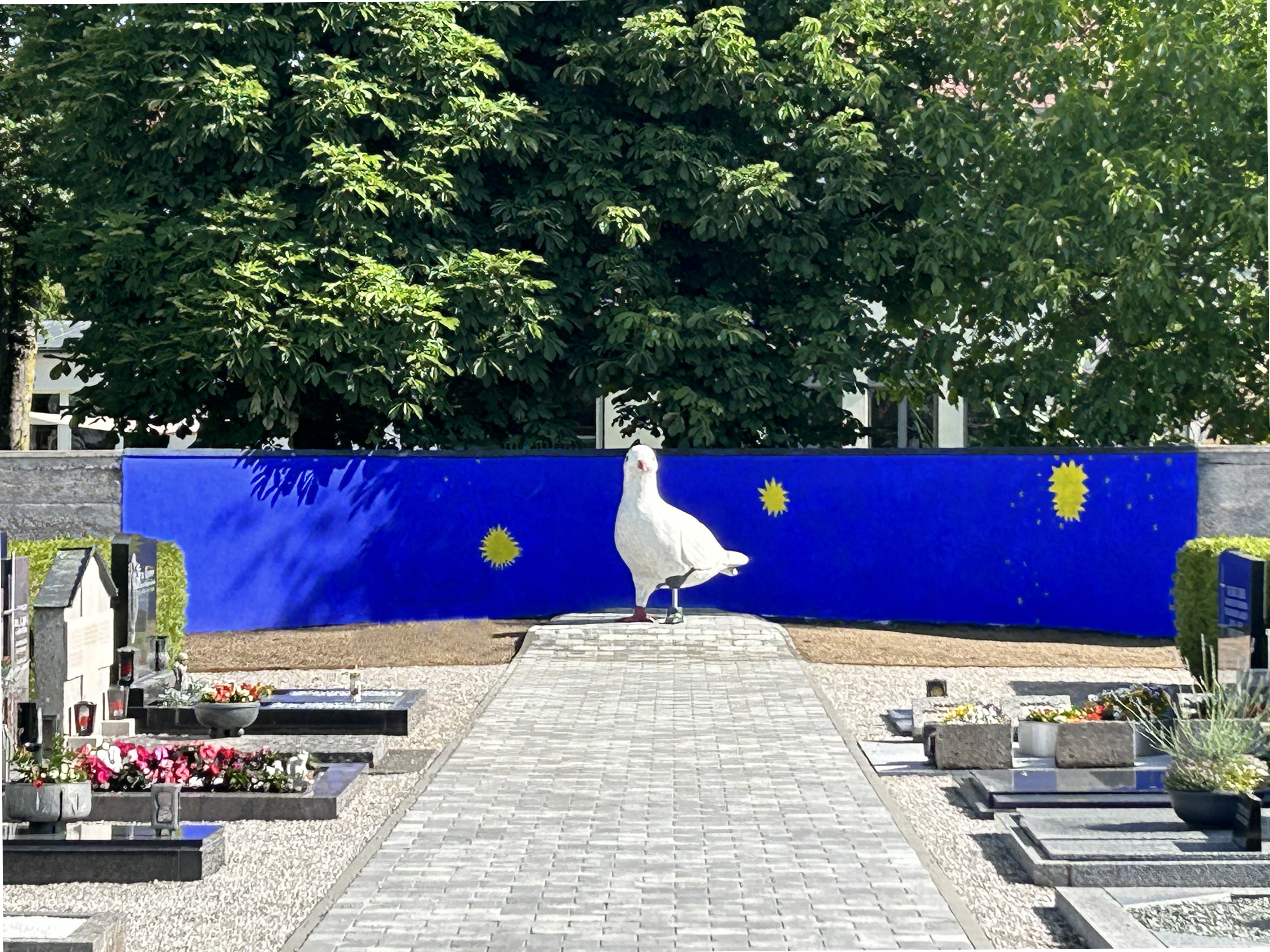 Der Künstler will mit dem Sternenhimmel im Hintergrund (Friedhofsmauer) einen fühlbaren Raum der Andacht schaffen. Aus dem Sternenhimmel ragen drei größere Sterne heraus. Auf einem dieser Sterne kann man die Inschrift „Der Himmel weint Frieden“ lesen. Ein zweiter Stern weist auf die Opfer des 1. und 2. Weltkrieges hin und ein dritter Stern auf jene der im Konzentrationslager Ermordeten. Ein schöner Gedanke: sie finden auf dem Friedhof ihren letzten Frieden - in unmittelbarer Nähe der Ehrengräber, ein Ort, der ihnen gebührt und ihrer würdig ist.