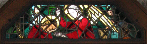 Gottes Fluchtplan ist im Inneren unserer Stadtkirche, im Oberlichtfenster über dem Südeingang dargestellt. Auch diese Glasmalerei wurde – wie die anderen Glasfenster – anlässlich der Kirchenrenovierung 1930-32 von Alfred Stifter gestaltet.